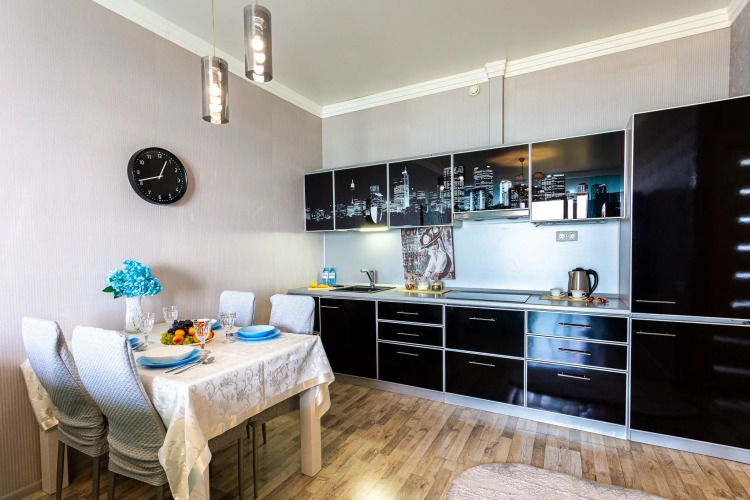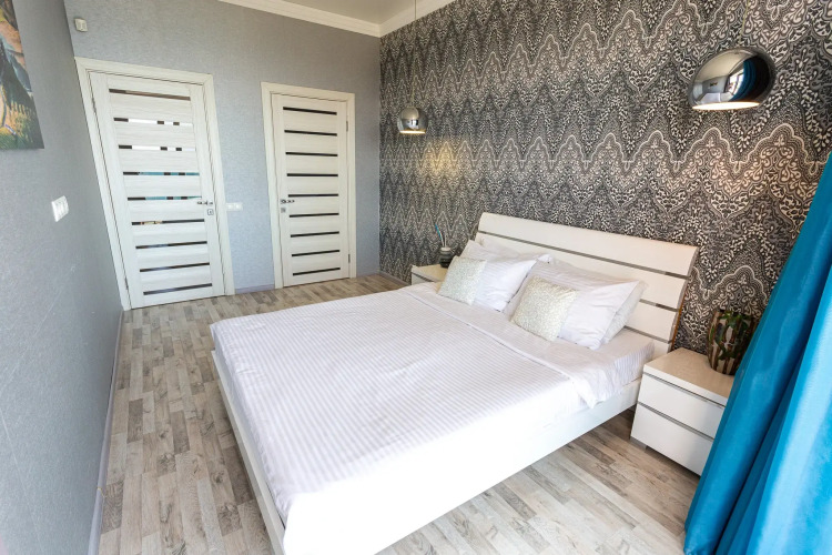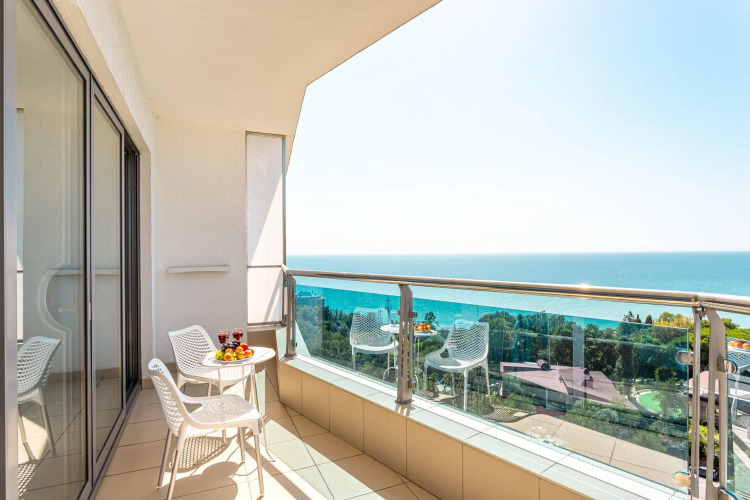 Апартаменты рассчитаны на проживание до 4-х человек. Отдельная спальня с двуспальной кроватью и гардеробной, кухня-гостиная с раскладным двуспальным диваном. Из каждой комнаты есть выход на балкон, где открывается вид на море.
