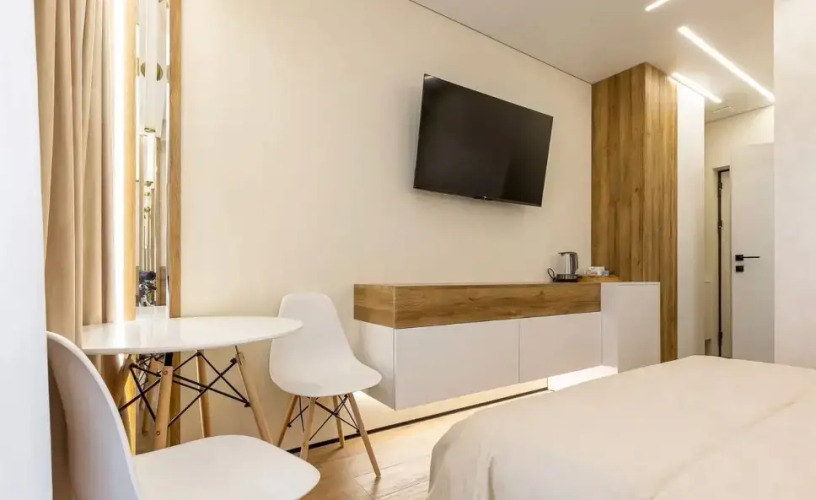 B апартаментах имеется холодильник, микроволновая печь, чайник, необходимая посуда, освещение с различными сценариями. Также в распоряжении гостей двуспальная кровать с белым постельным бельём, Wi-Fi, телевизор смарт-ТВ, в ванной комнате имеется душевая кабина, полотенца, гигиенические средства, фен, стиральная машина, гладильная доска, утюг, сушилка.