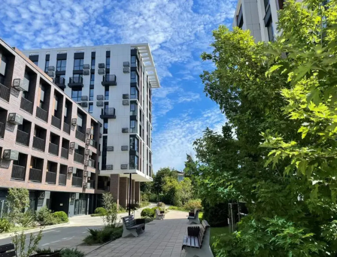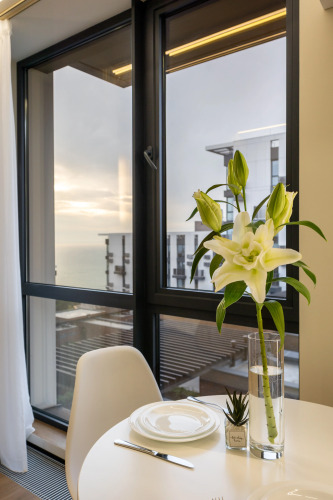В пользовании гостей в жилом комплексе большая открытая терраса с шезлонгами, столами, стульями, озеленением и видом на море. Площадка территории охраняемая, с видеонаблюдением. На 1 этаже находятся магазины и кафе, на территории находятся площадки для занятия спортом.