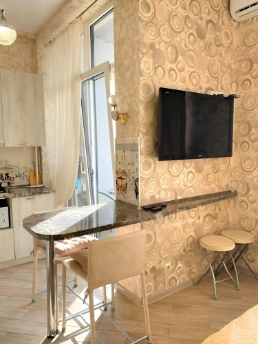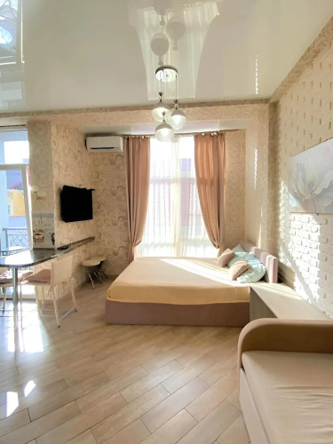 В студии проведён ремонт, есть необходимая мебель. В распоряжении гостей есть двухместная кровать, раскладной диван, кухонная зона с полным наполнением: газовая плита, микроволновая печь, чайник, посуда; телевизор, кондиционер, стиральная машина, фен, утюг, сушилка для белья. Также предоставляется постельное бельё и полотенца. В апартаментах работает бесплатный Wi-Fi. В квартире имеется балкон.