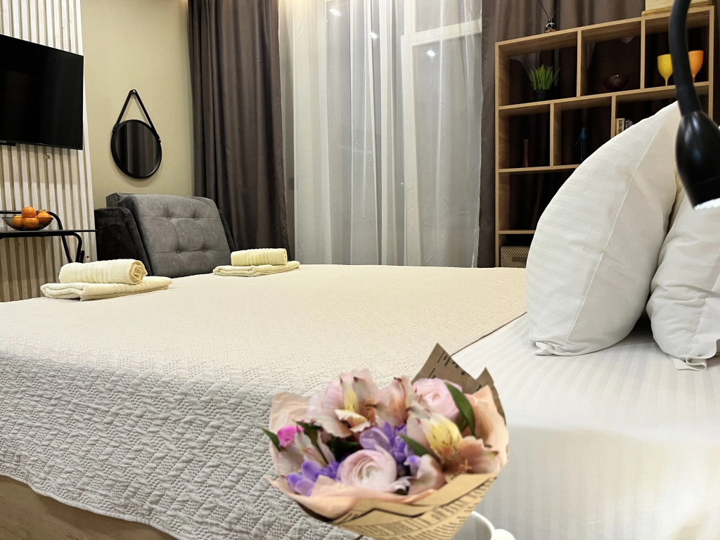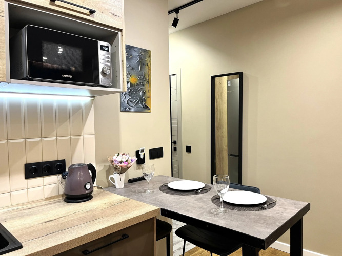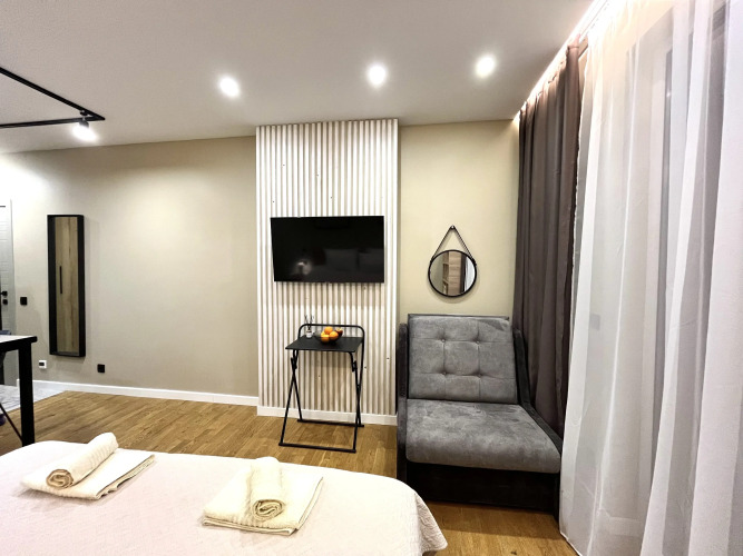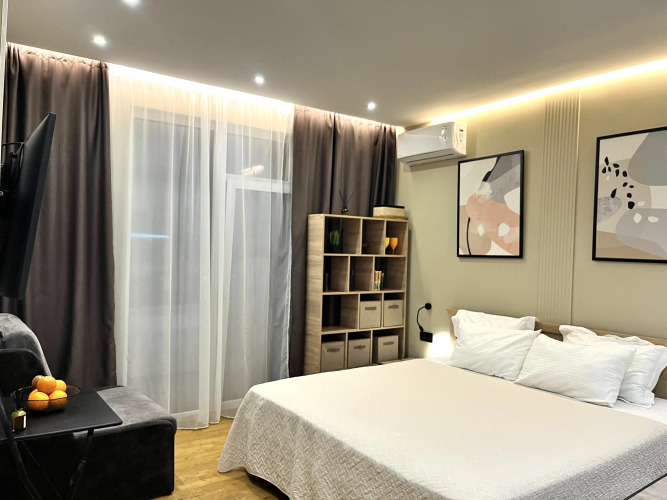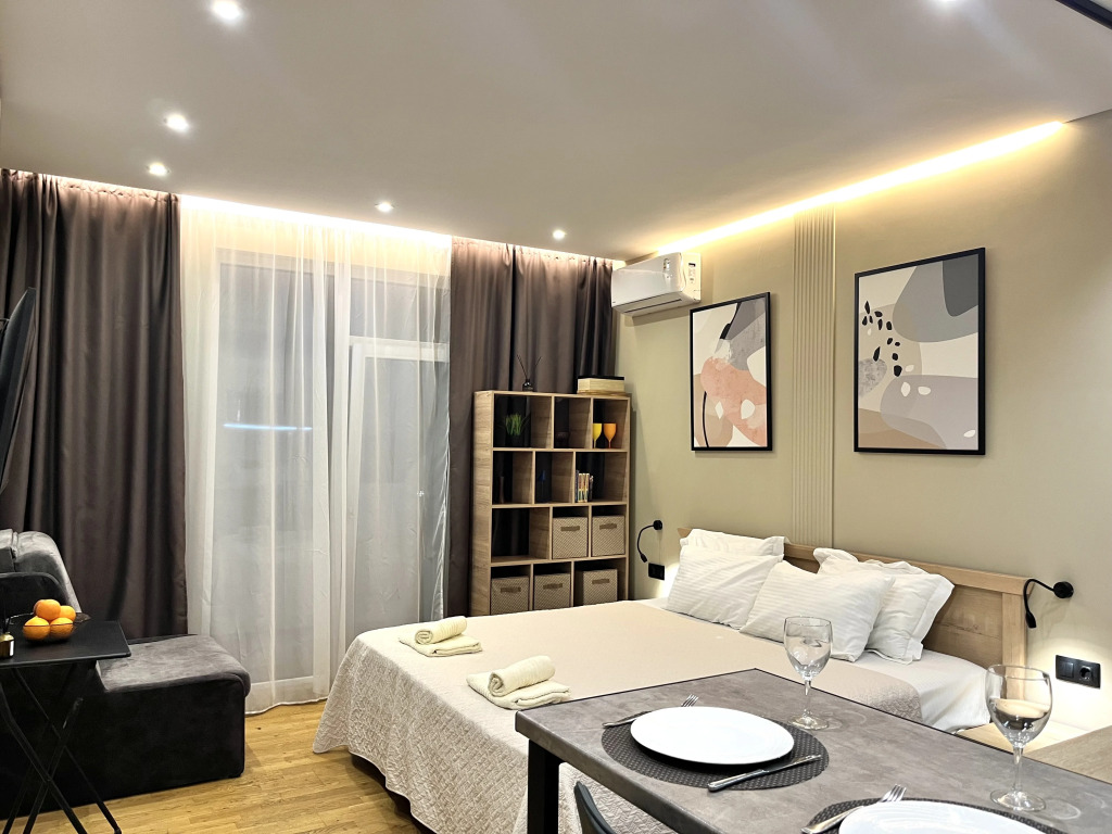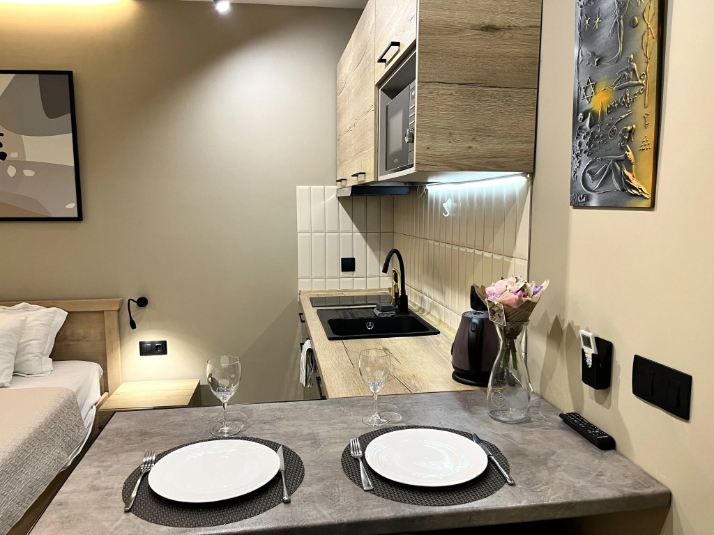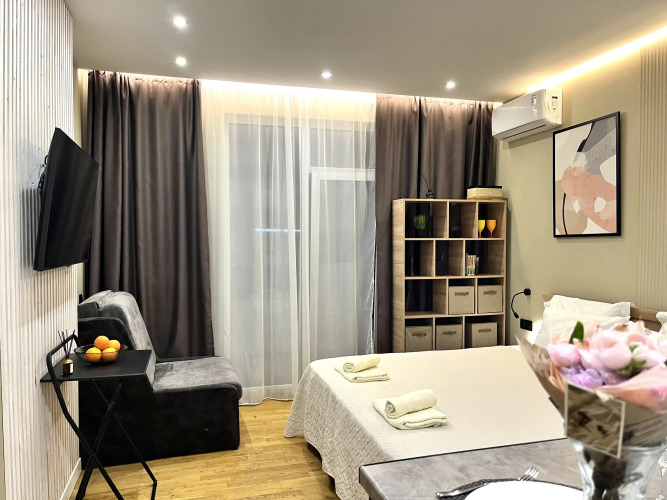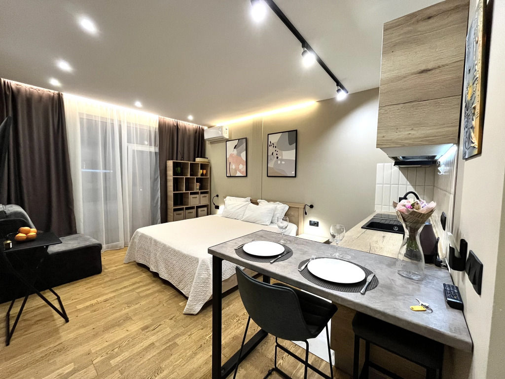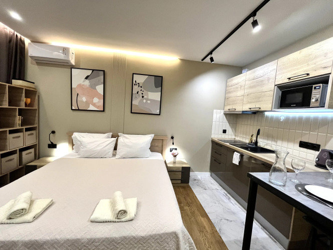 В апартаментах есть балкон, откуда открывается вид на море и горы. В распоряжении гостей: фен, гладильная доска, утюг, стиральная машина, микроволновая печь, плита, посуда, сплит-система и сушилка. Гостям предоставляются постельное бельё, полотенца, средства гигиены, бесплатный доступ к сети Wi-Fi. Обеспечен круглосуточный доступ к горячей воде. Автомобиль можно припарковать на общественной парковке вдоль дороги.