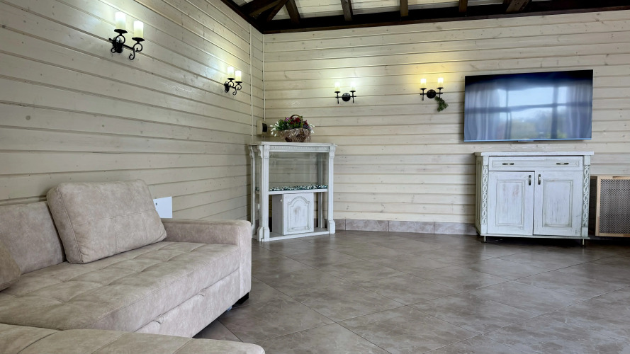 Отдельно стоящее здание площадью 80 кв.м организовано под кухню. В нём находится обеденный стол на 15-20 человек, угловой двуспальный диван, телевизор и кухонный гарнитур.