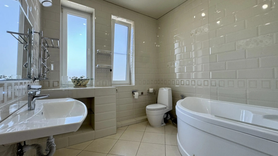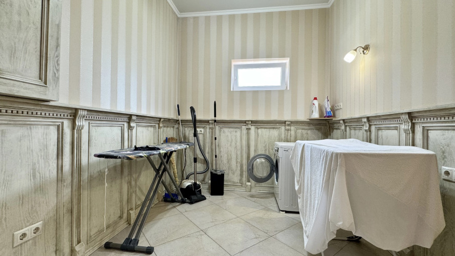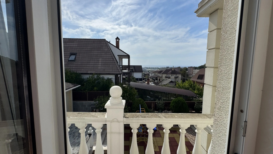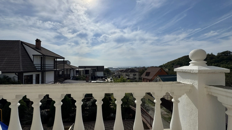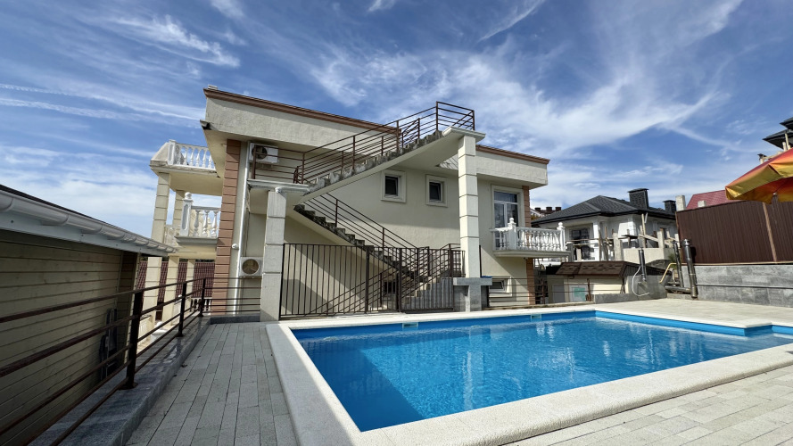 Дом располагается на охраняемой территории. В коттедже есть подогреваемый бассейн, панорамная площадка с видом на море, детская площадка, зона барбекю и гараж на четыре автомобиля.