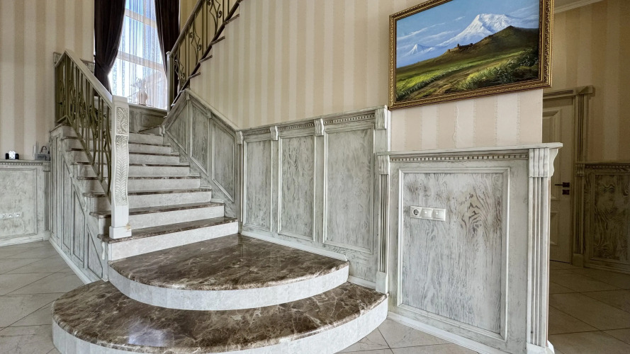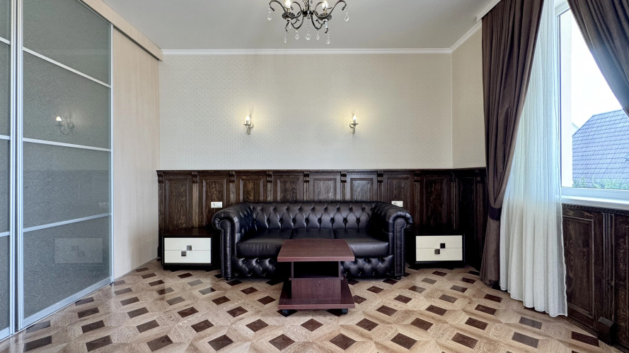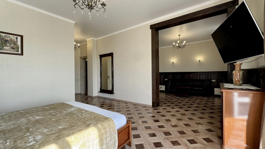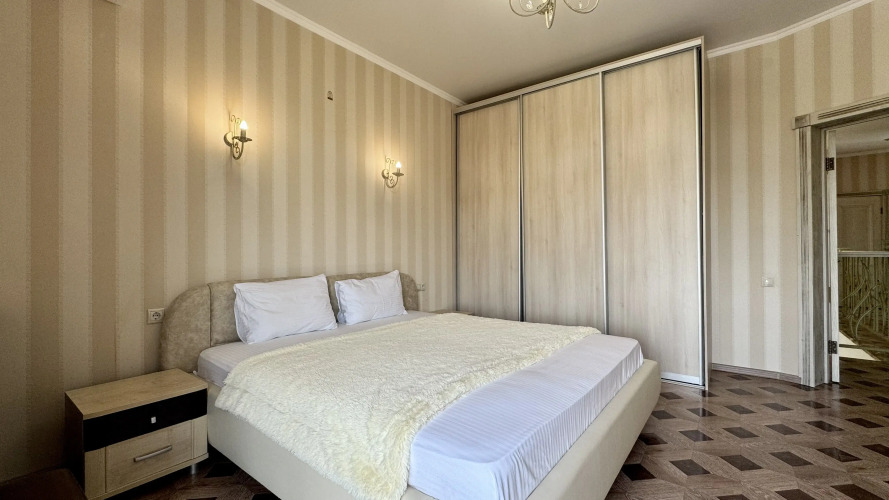 На втором этаже: мастер-спальня и три спальни. Мастер-спальня площадью 60 кв.м оборудована кроватью 180 см, собственным санузлом, телевизором, гостиной зоной с кожаным диваном и гардеробной. Из неё есть выход на террасу. В спальне площадью 22 кв.м есть кровать 180 см, шкаф-купе и балкон. В спальне площадью 22 кв.м также есть кровать 160 см, шкаф-купе и балкон. Спальня площадью 18 кв.м оснащена кроватью, шкафом и балконом.
