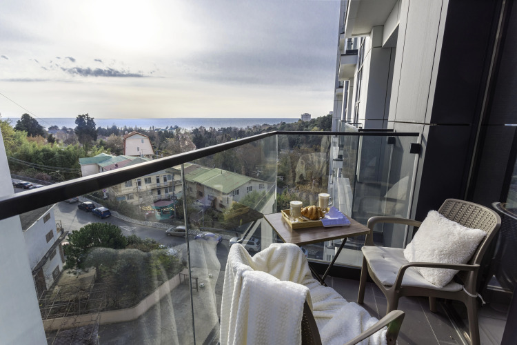 Апартаменты имеют балкон и вид на море, вмещают до 4-х гостей. Комнаты разделены на отдельные зоны: спальню, кухню, гардеробную и ванную. Квартира оборудована современным газовым отоплением, а также тёплыми полами. Из каждой комнаты гости могут выйти на балкон, который обрамлён панорамными окнами и алюминиевым профилем. Здесь гости могут насладиться видами, расслабиться за чашкой кофе, расположившись за кофейным столиком и двумя креслами.
