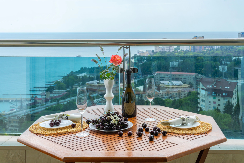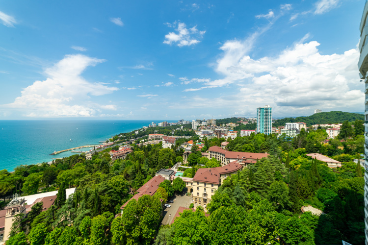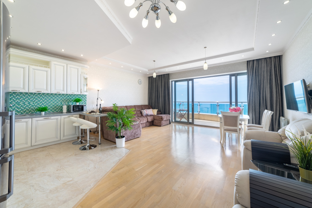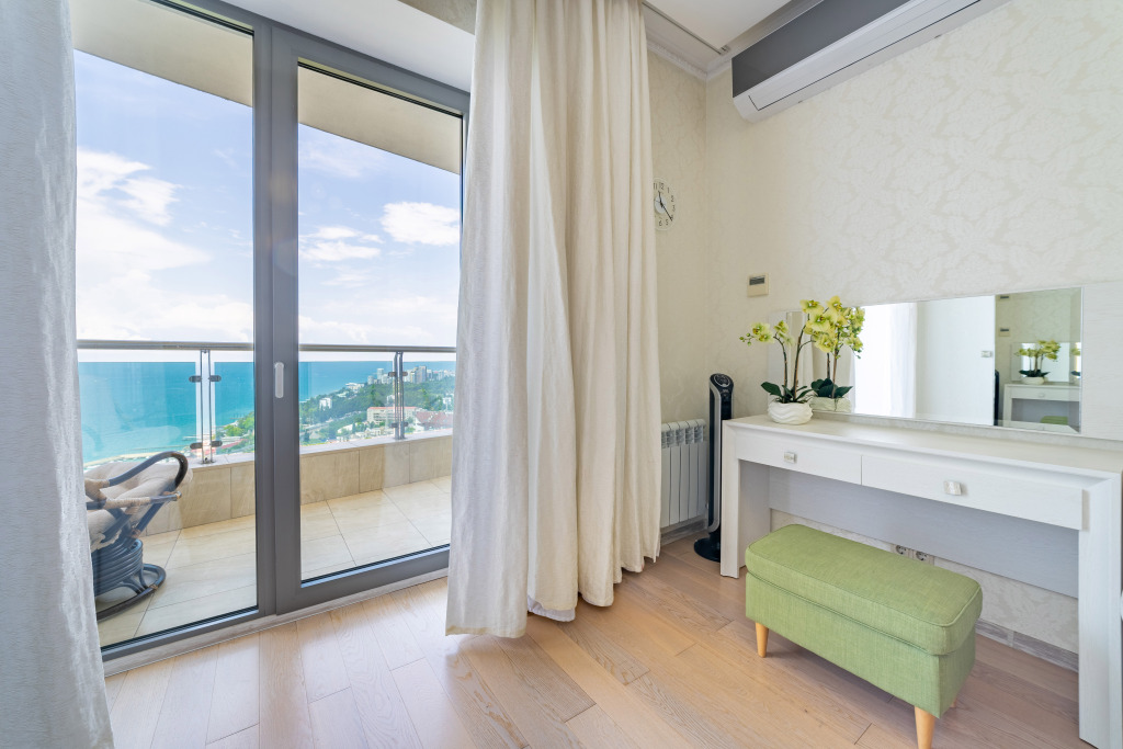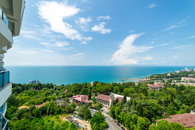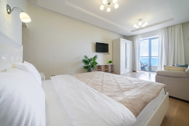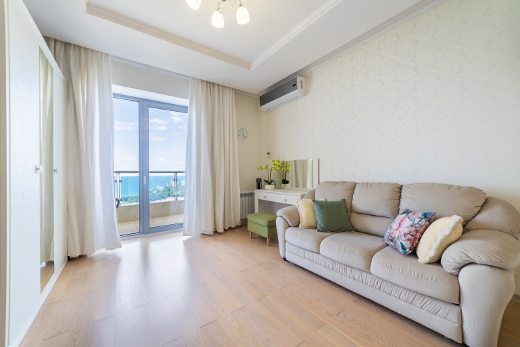 Квартира площадью 130 кв. м рассчитана на размещение до 10 гостей. Дополнительно предоставляется детская кроватка. В квартире три санузла, две террасы с мебелью, панорамные окна с видом на море и горы.
