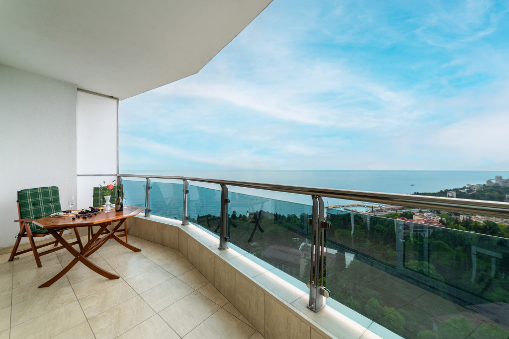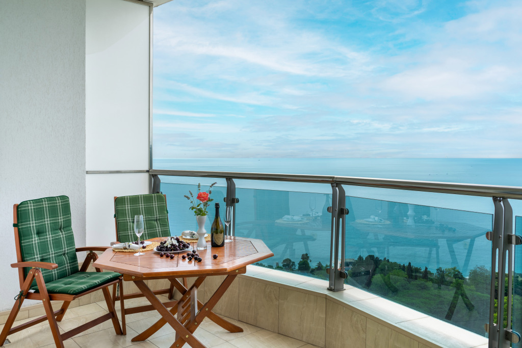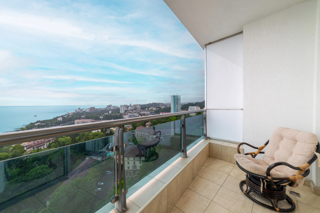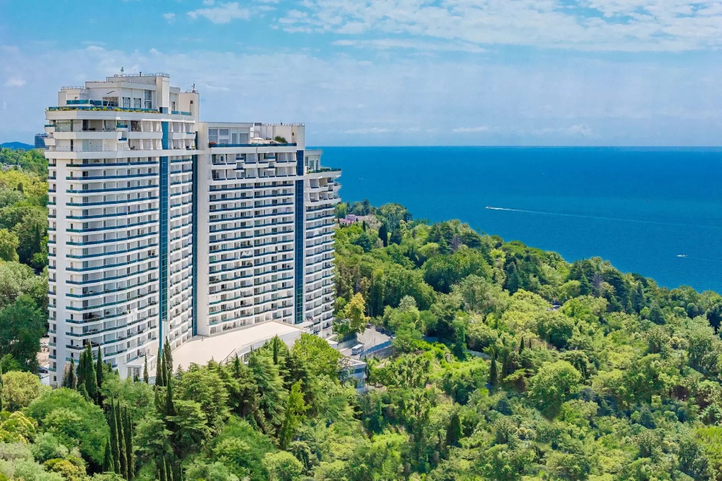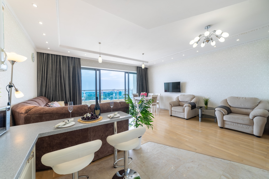 Квартира площадью 130 кв. м рассчитана на размещение до 10 гостей. Дополнительно предоставляется детская кроватка. В квартире три санузла, две террасы с мебелью, панорамные окна с видом на море и горы.