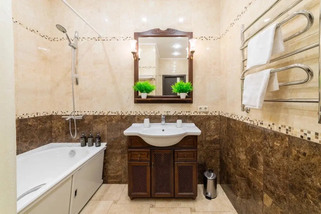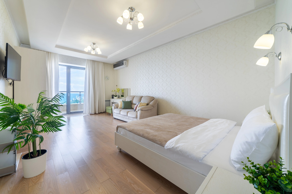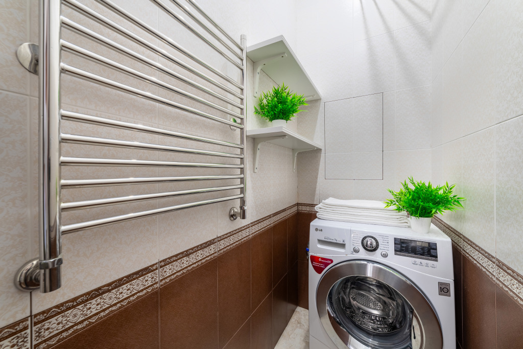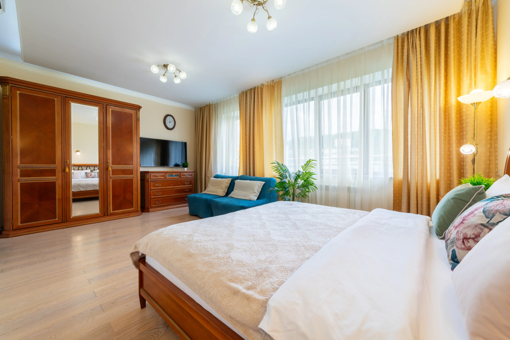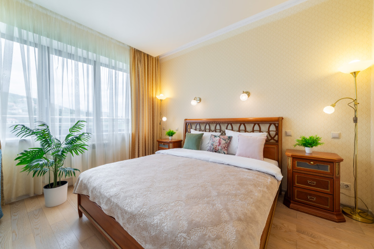 Апартаменты оборудованы для комфортного проживания: есть посудомоечная машина, кофемашина, стиральная машина, микроволновая печь, кондиционеры в каждой комнате, два фена, Wi-Fi, утюг, гладильная доска, чайник и Smart TV в каждой комнате. На окнах установлены затемняющие шторы. Предоставляются постельное бельё и полотенца.
