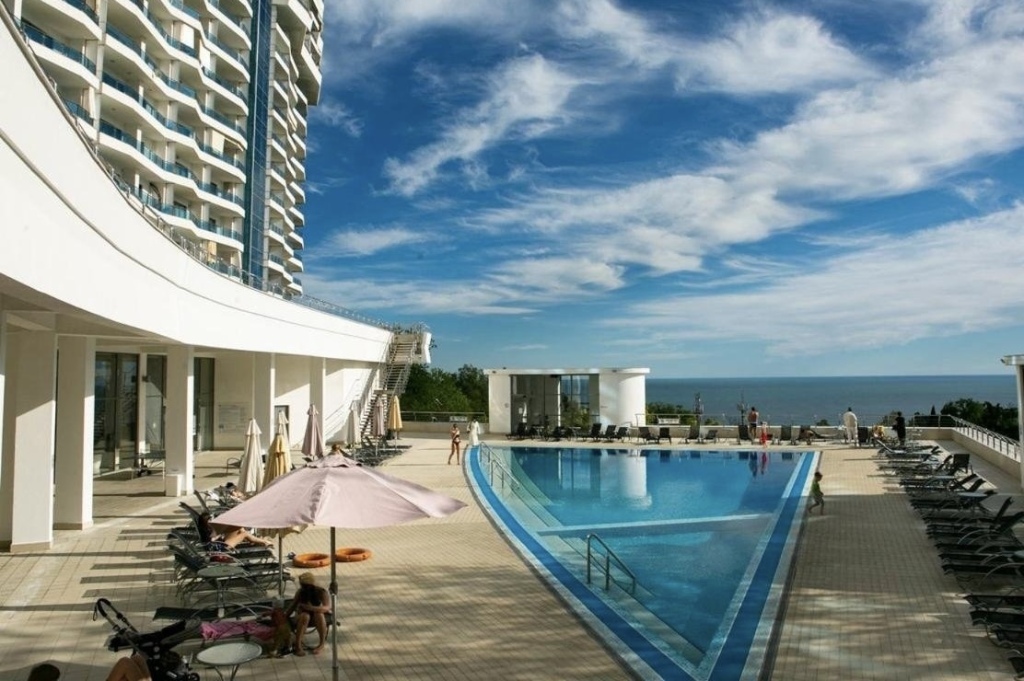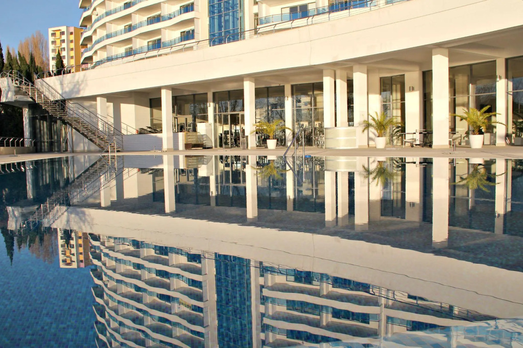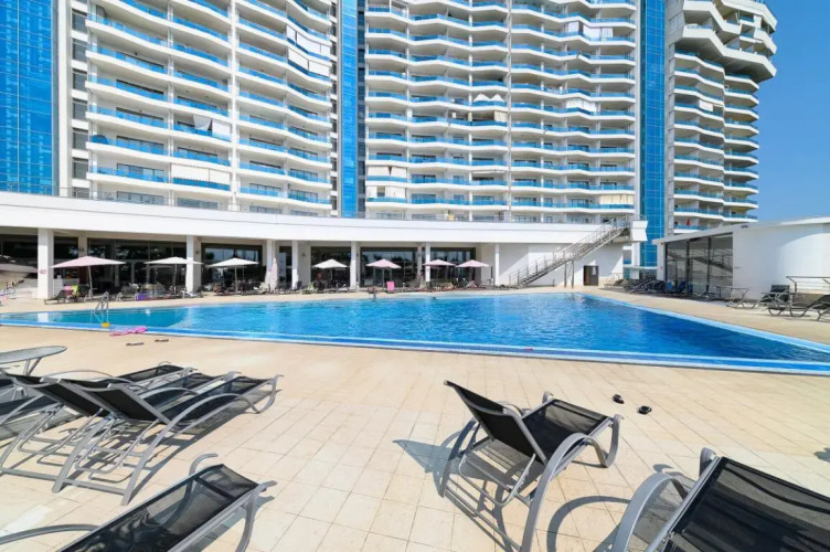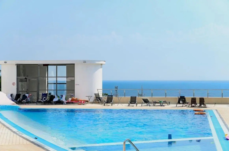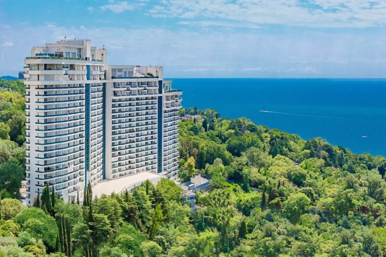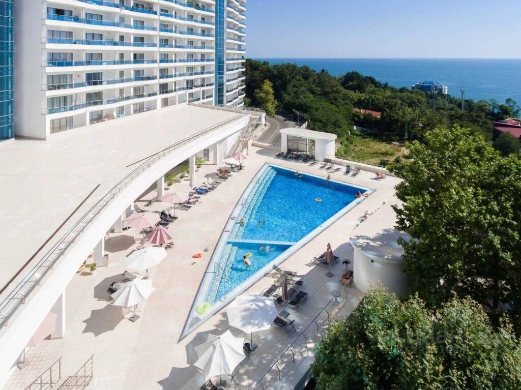 Квартира с двумя террасами и бассейном расположена в жилом комплексе «Идеал Хаус» в Сочи. Рядом находятся остановка общественного транспорта, магазины, кафе и санатории. Неподалеку расположены Дендрарий, театры, музеи, концертные залы и рестораны. Можно добраться до аэропорта, вокзалов и Красной Поляны на транспорте. На территории жилого комплекса находятся продуктовый магазин, аптека, массажный салон, салон красоты и спа-центр.