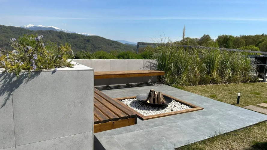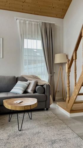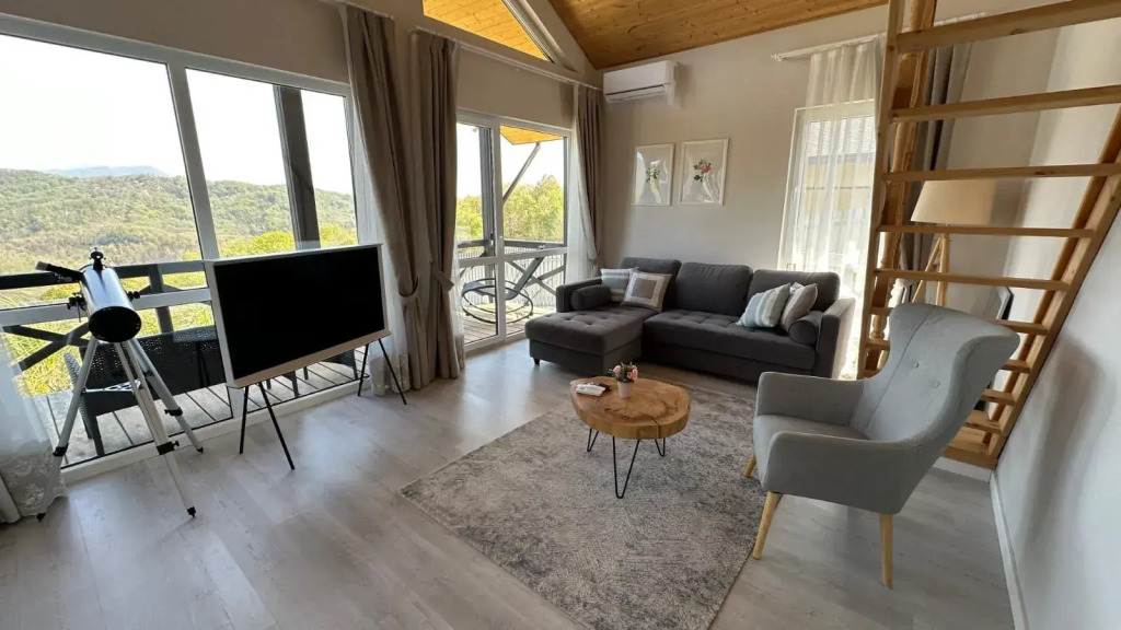 Возможно размещение до 6 человек. На первом этаже расположены кухня-гостиная с раскладным диваном, ванная комната, две спальни с двуспальными кроватями. На втором этаже находятся две односпальные кровати. Дом оснащён кондиционерами, телевизором, панорамными окнами. Предоставляется комплект постельного белья, полотенец. Из окон открывается вид на горы.