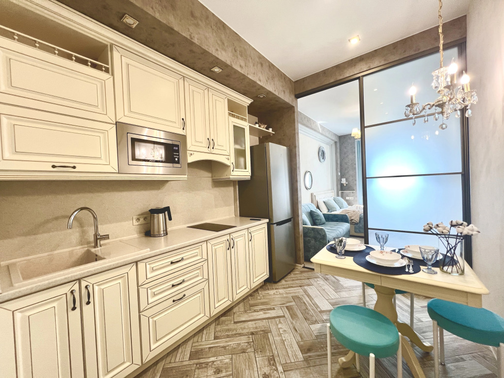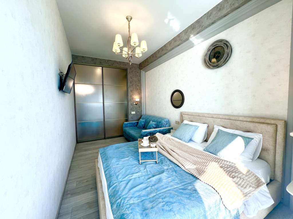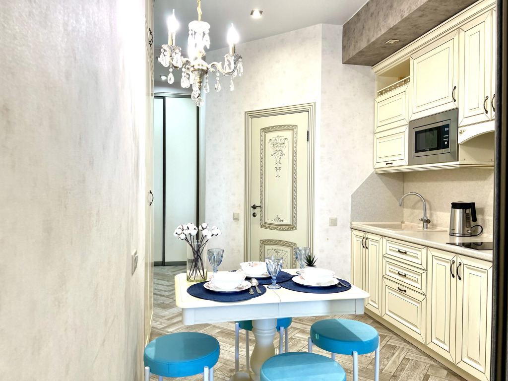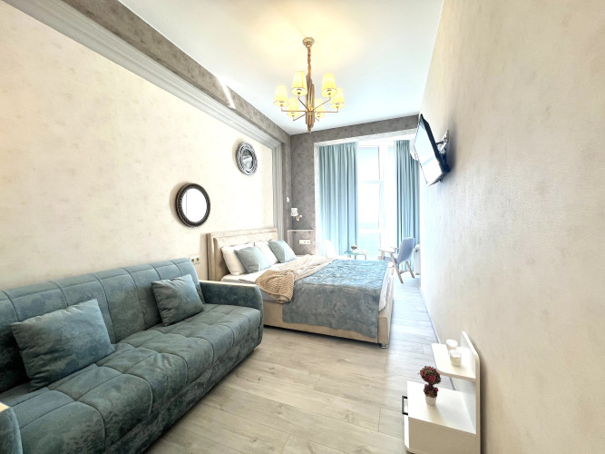 В апартаментах: двуспальная кровать с ортопедическим матрасом, раскладной диван. К услугам гостей: постельное бельё из прачечной, клининг, средства гигиены, посуда, техника, посуда, электротурка и скоростной интернет. Кухня оборудована: холодильник, варочная панель, микроволновая печь, духовка, чайник, посуда, приборы и фильтр для питьевой воды, фен, Smаrt-ТV, высокоскоростной Wi-Fi. На каждого гостя предусмотрено по 2 полотенца. Замена белья и полотенец производится за дополнительную плату.