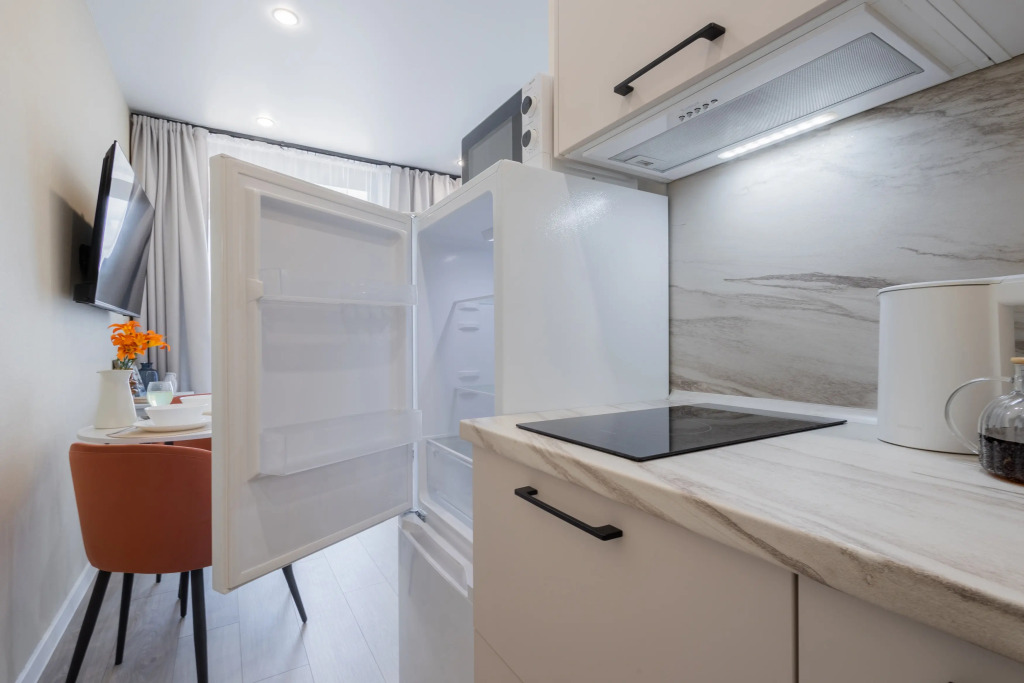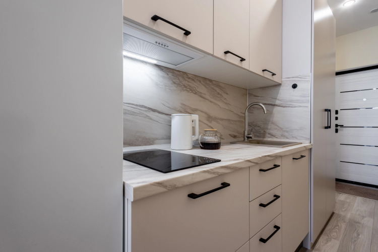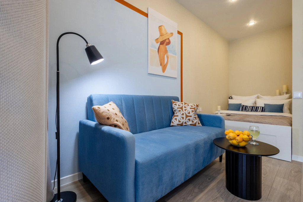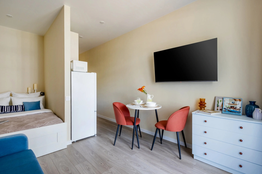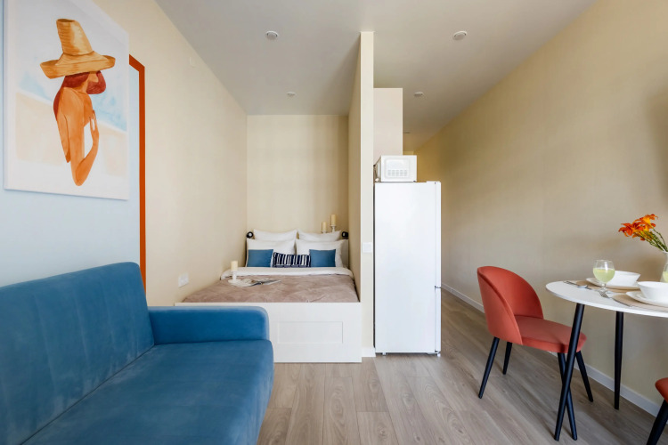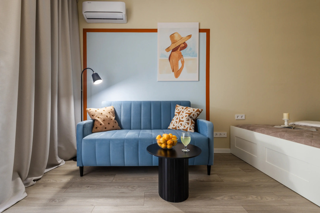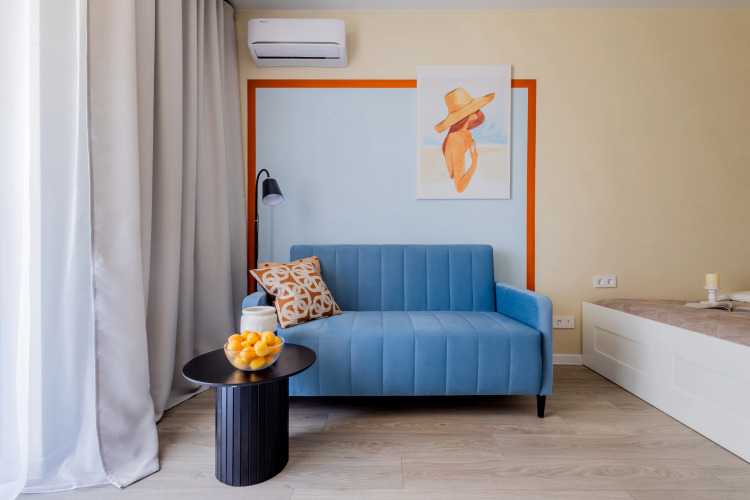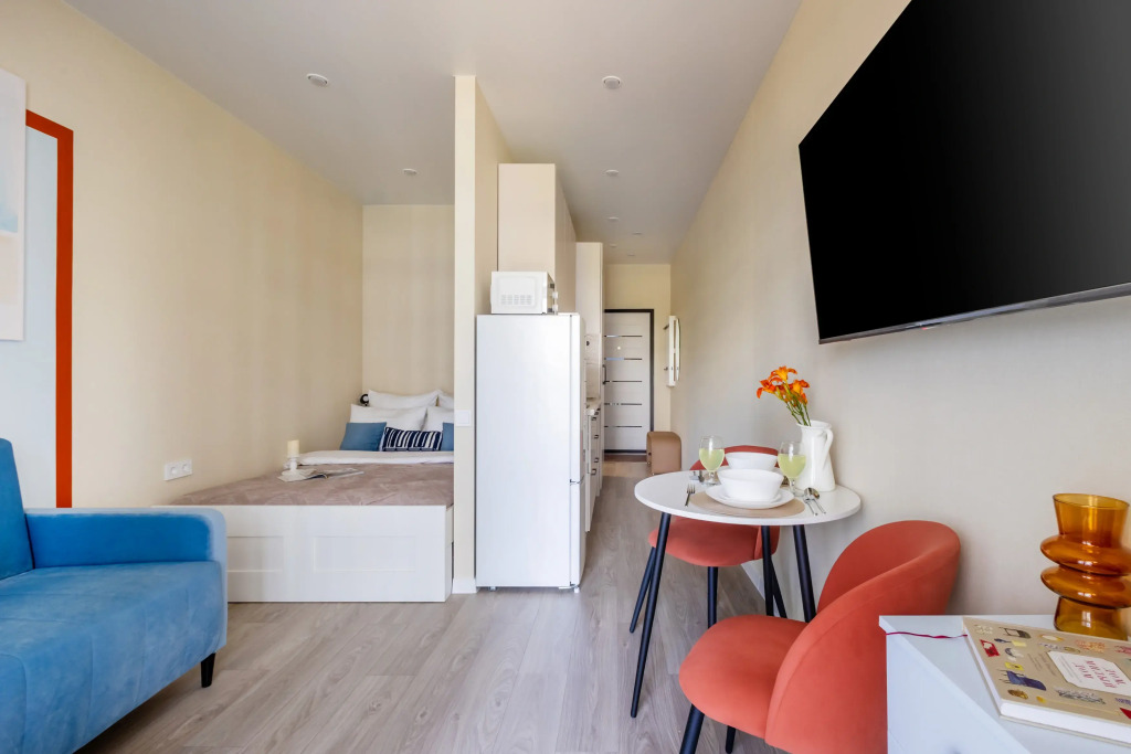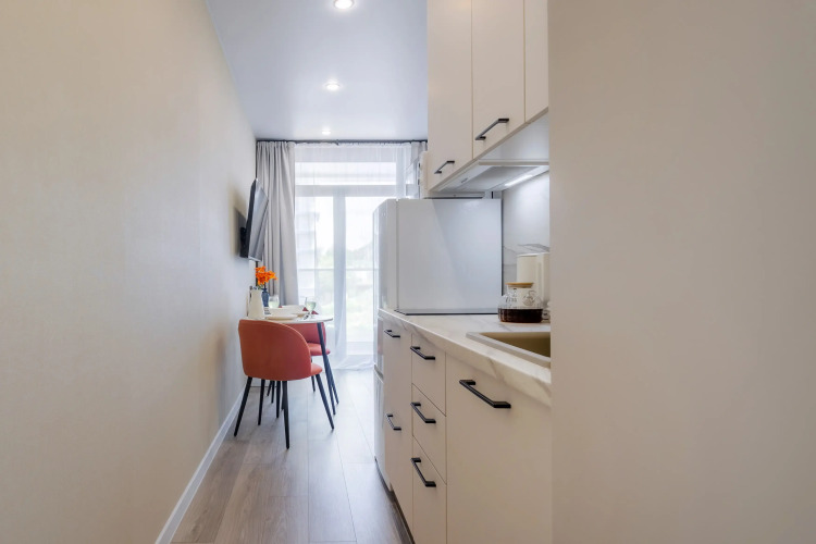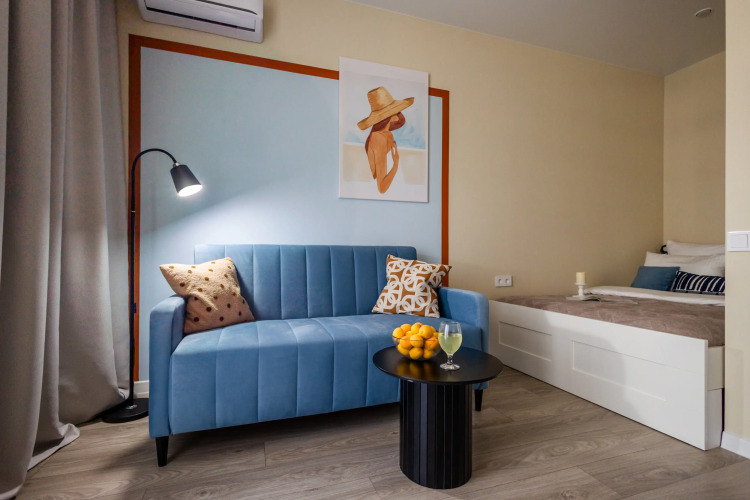 Квартира-студия рассчитана на размещение до четырёх гостей. В распоряжении гостей двуспальная кровать, диван, кухня, ванная комната, мебель, бытовая техника и посуда. Из окон и с балкона открывается вид на горы.