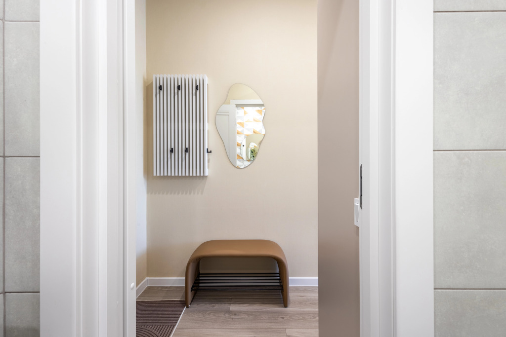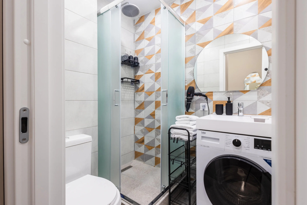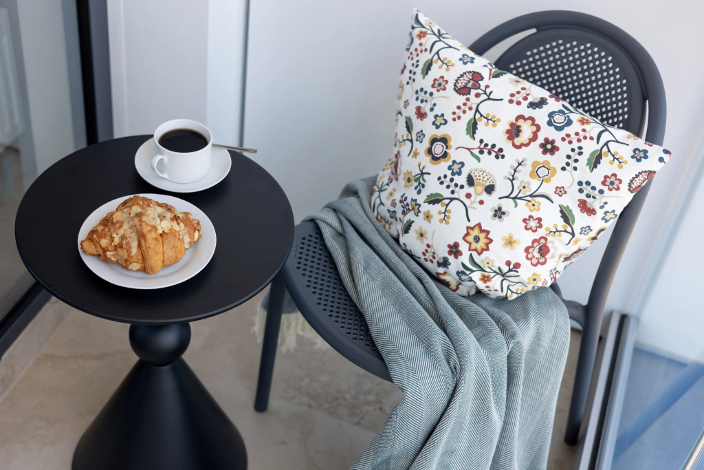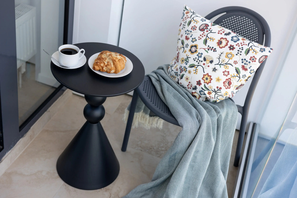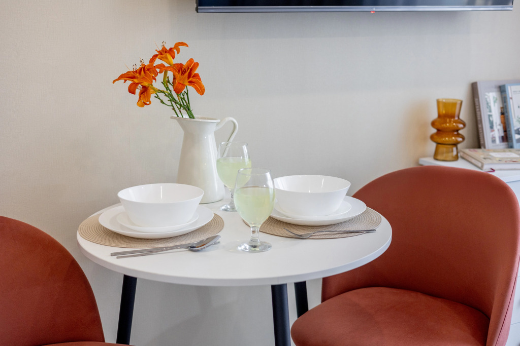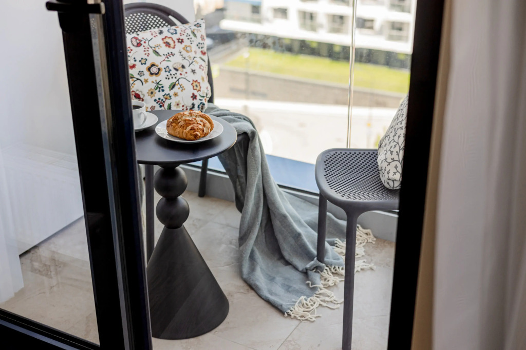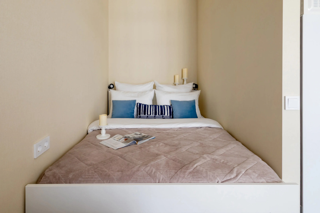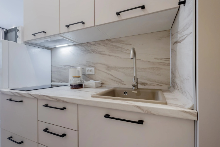 Квартира-студия рассчитана на размещение до четырёх гостей. В распоряжении гостей двуспальная кровать, диван, кухня, ванная комната, мебель, бытовая техника и посуда. Из окон и с балкона открывается вид на горы.