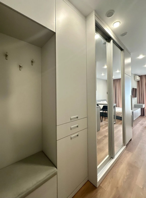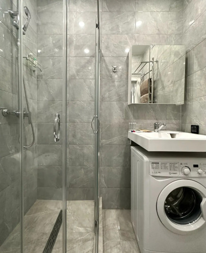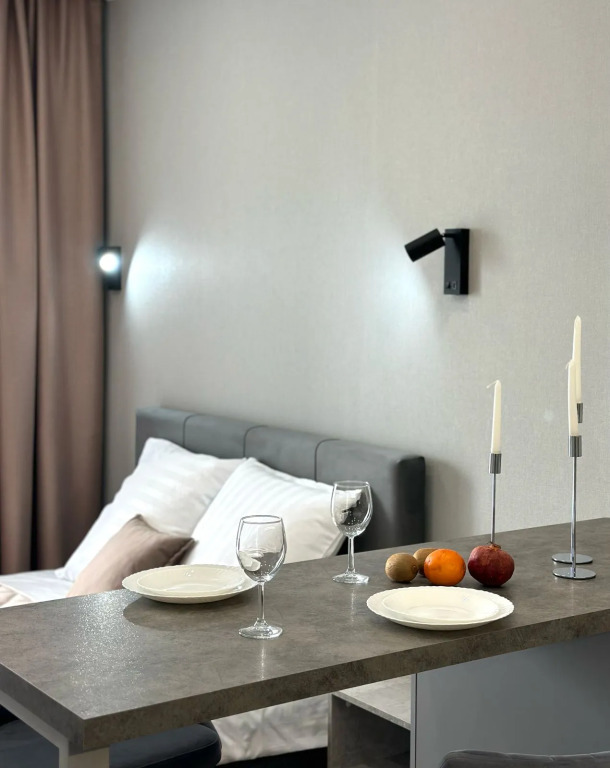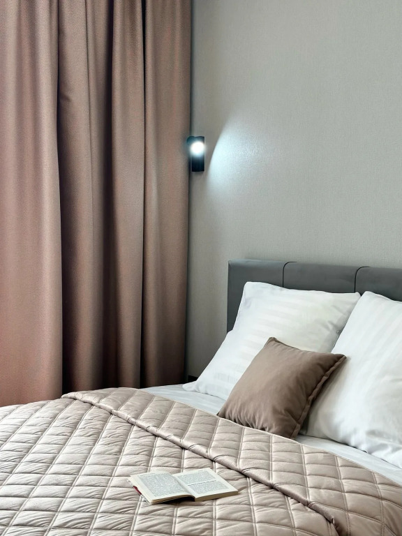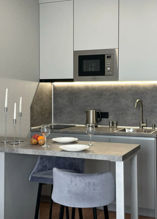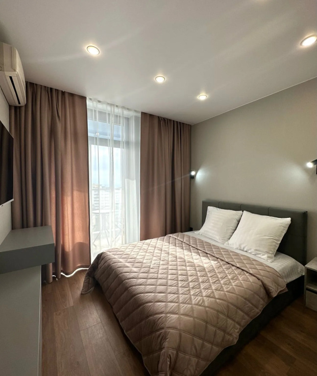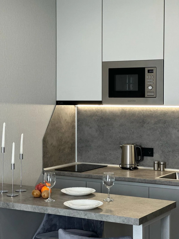 Квартира укомплектована всем необходимым: кухонный гарнитур, посуда, электроплита, посудомоечная машина, микроволновая печь, чайник, холодильник, утюг, гладильная доска, фен, стиральная машина, кондиционер, Smart TV и скоростной интернет. В спальной зоне установлена двуспальная кровать 160×200 см. В квартире есть полноценная ванная комната и балкон с мебелью для отдыха.