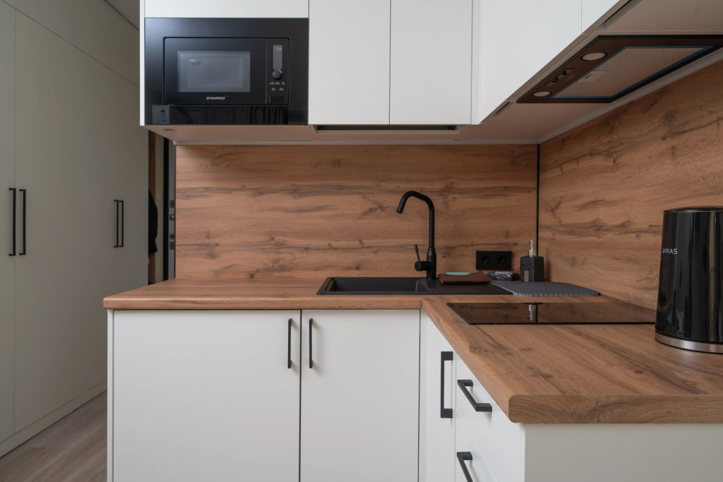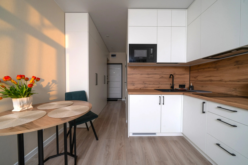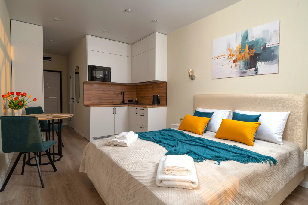 Студия подходит для отдыха, командировки или романтического уикенда. В распоряжении гостей: комната с двуспальной кроватью, бельём и диваном, Smart-TV, Wi-Fi. Укомплектованная кухня: варочная панель, холодильник, микроволновка, чайник, посуда.