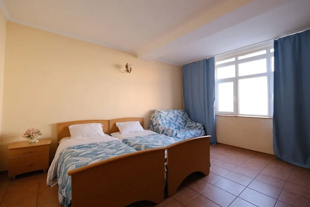 В номере вы найдёте душ, телевизор и тапочки. Оснащение зависит от выбранной категории номера.