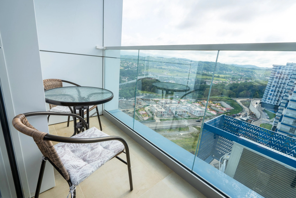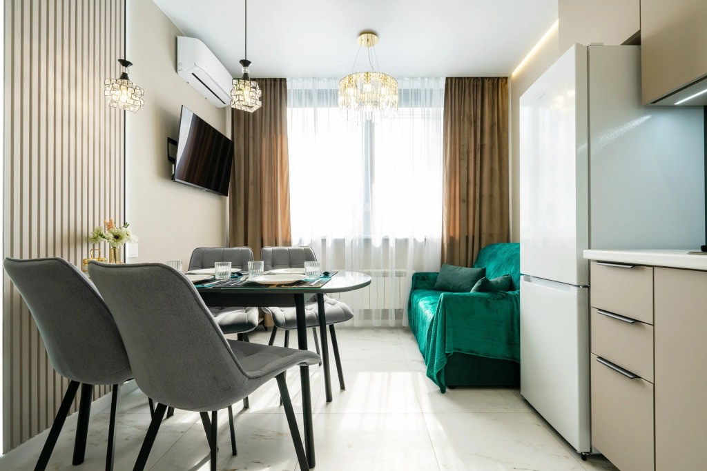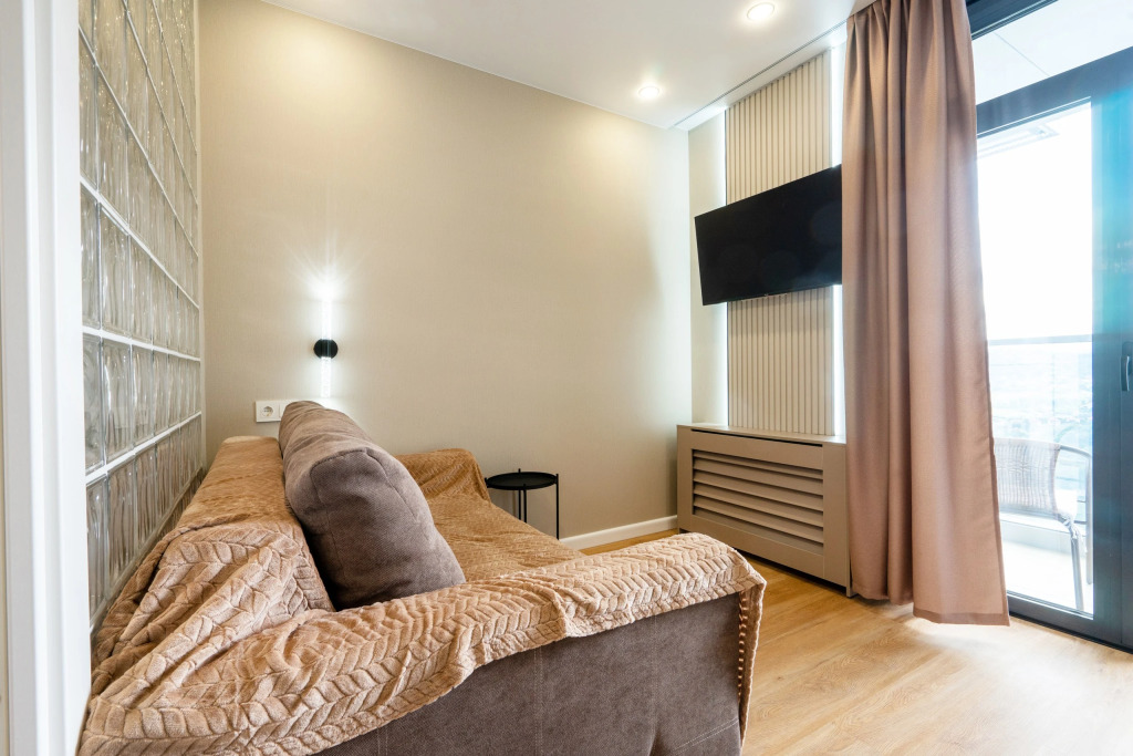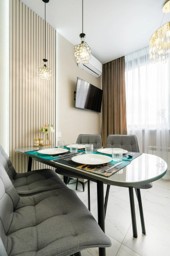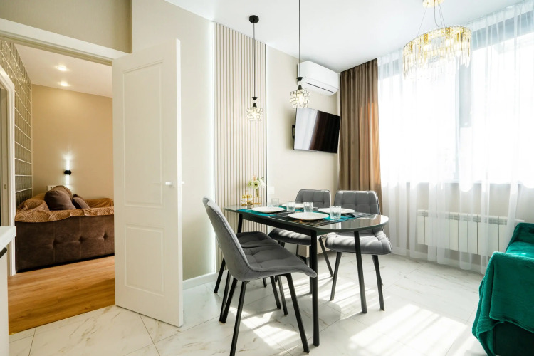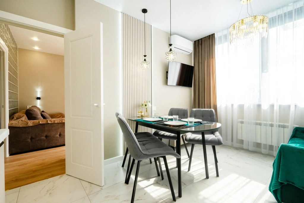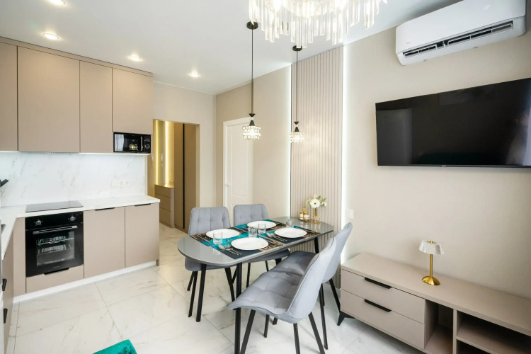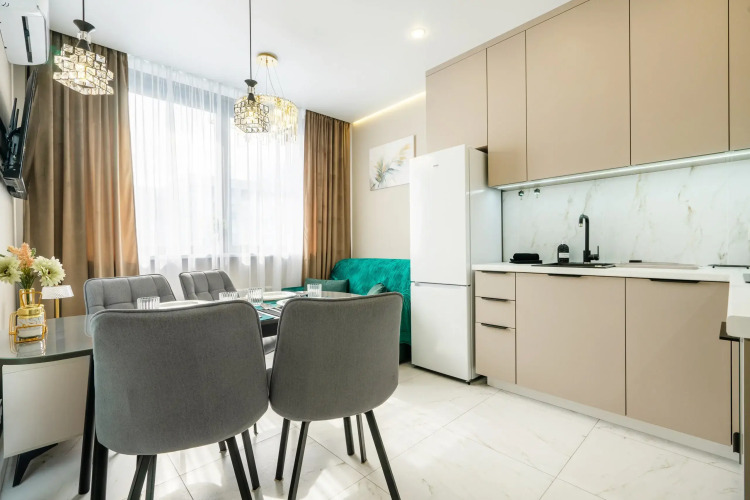 Апартаменты с индивидуальным балконом подходят для размещения 4 гостей. Организовано 2 спальных места: двуспальная кровать и раскладной диван. Установлены туалетный столик и вместительный шкаф. Предусмотрена обеденная зона и оборудованная кухня с холодильником, варочной панелью, вытяжным шкафом, микроволновой печью, чайником, посудой и столовыми приборами. В апартаментах есть сплит-система, смарт-телевизор, Wi-Fi, стиральная машина, фен, утюг, гладильная доска и сушилка для белья. Санузел совмещённый, с душем. Подготовлены постельные принадлежности, полотенца, мыло, гель для душа, шампунь и средство для мытья посуды.