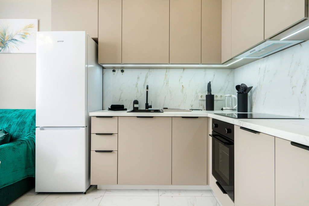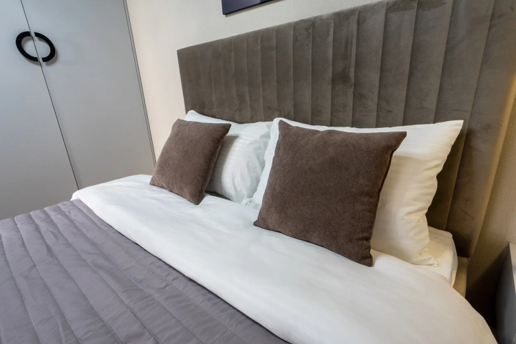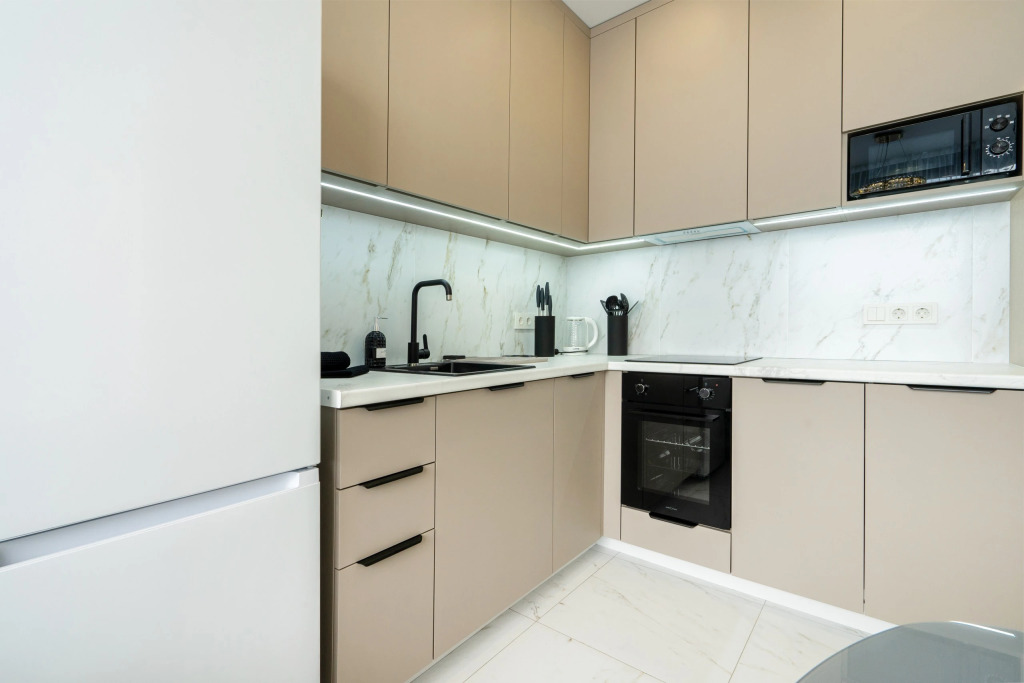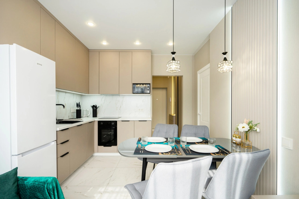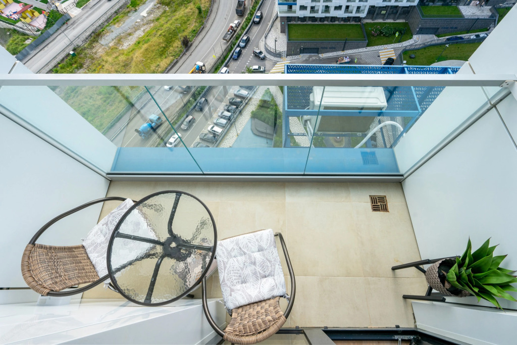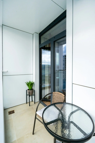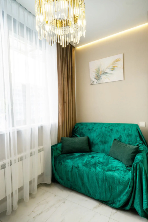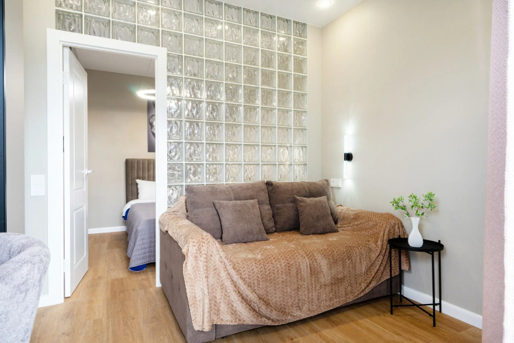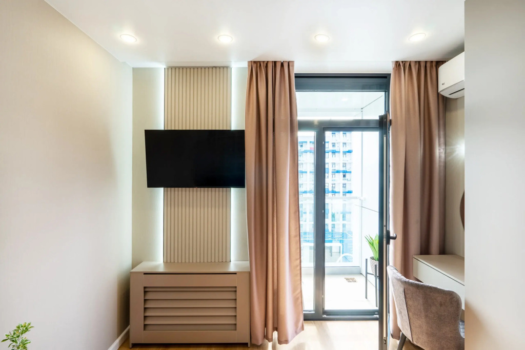 Апартаменты с индивидуальным балконом подходят для размещения 4 гостей. Организовано 2 спальных места: двуспальная кровать и раскладной диван. Установлены туалетный столик и вместительный шкаф. Предусмотрена обеденная зона и оборудованная кухня с холодильником, варочной панелью, вытяжным шкафом, микроволновой печью, чайником, посудой и столовыми приборами. В апартаментах есть сплит-система, смарт-телевизор, Wi-Fi, стиральная машина, фен, утюг, гладильная доска и сушилка для белья. Санузел совмещённый, с душем. Подготовлены постельные принадлежности, полотенца, мыло, гель для душа, шампунь и средство для мытья посуды.