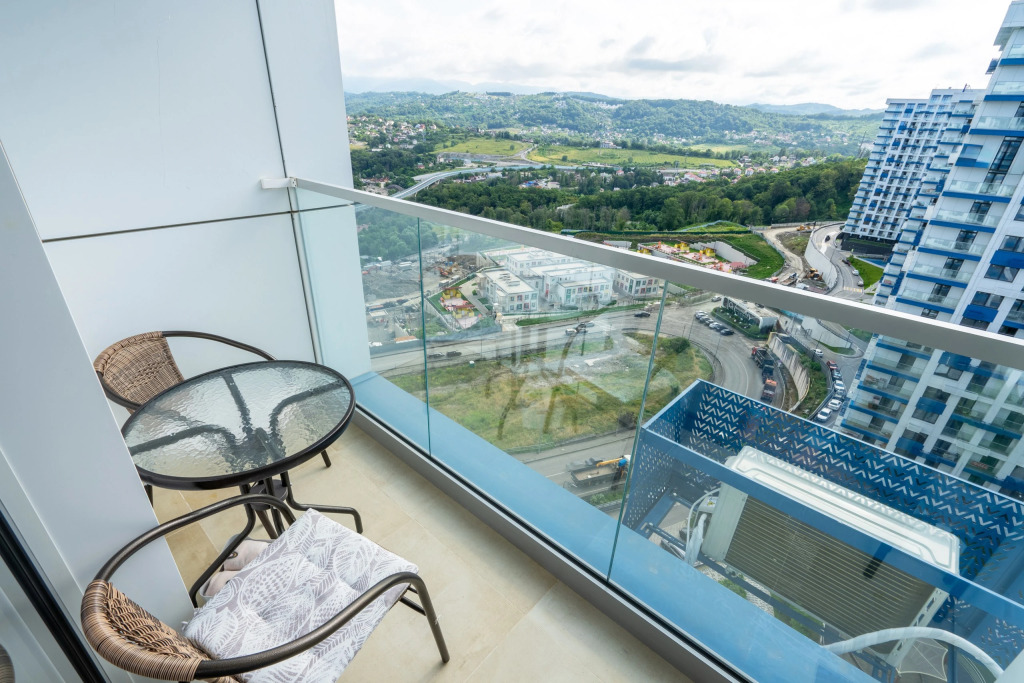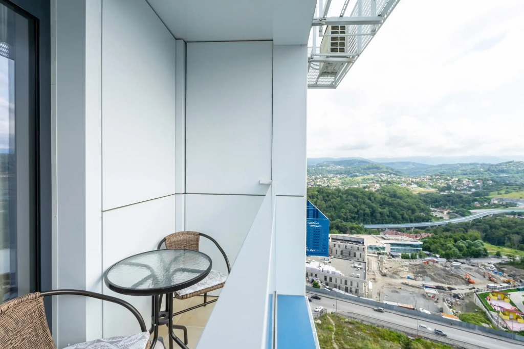 Апартаменты «Стильные апартаменты с видом на горы» находятся в Сочи, в районе Новый Сочи, в жилом комплексе бизнес-класса «Кислород». В транспортной доступности — городские пляжи и парк «Дендрарий».