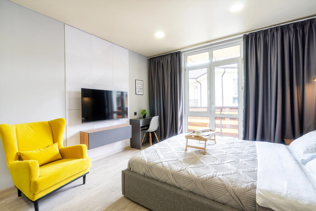 В номере вы найдёте телевизор. Оснащение зависит от выбранной категории номера.