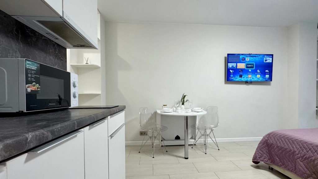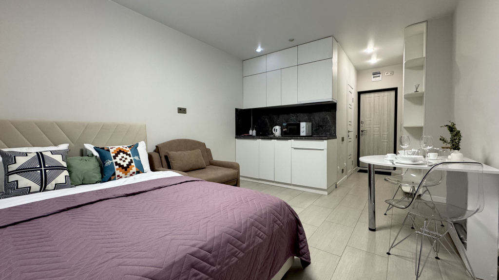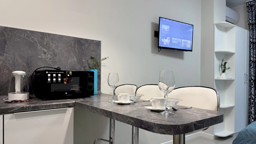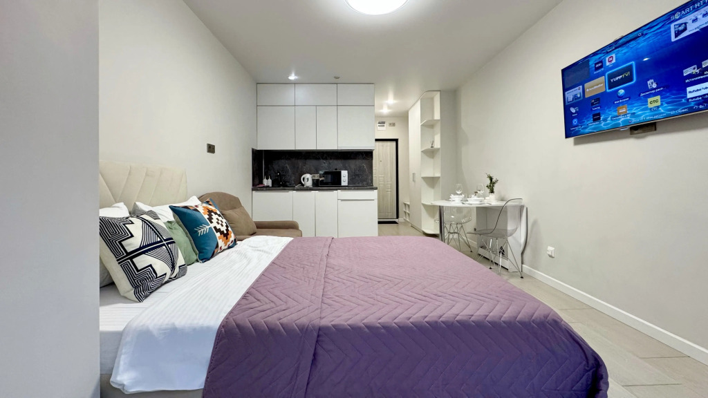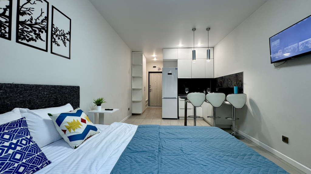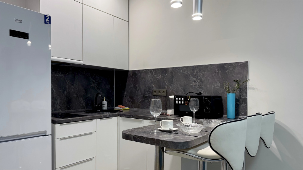 В квартире есть необходимое для проживания гостей: двуспальная кровать, постельное бельё, полотенца, микроволновая печь, электрочайник, кондиционер, телевизор, стиральная машина, двухкамерный холодильник, барная стойка, Smart TV, Wi-Fi, водонагреватель, душ, гель, шампунь, кондиционер, пылесос, тёплый пол.