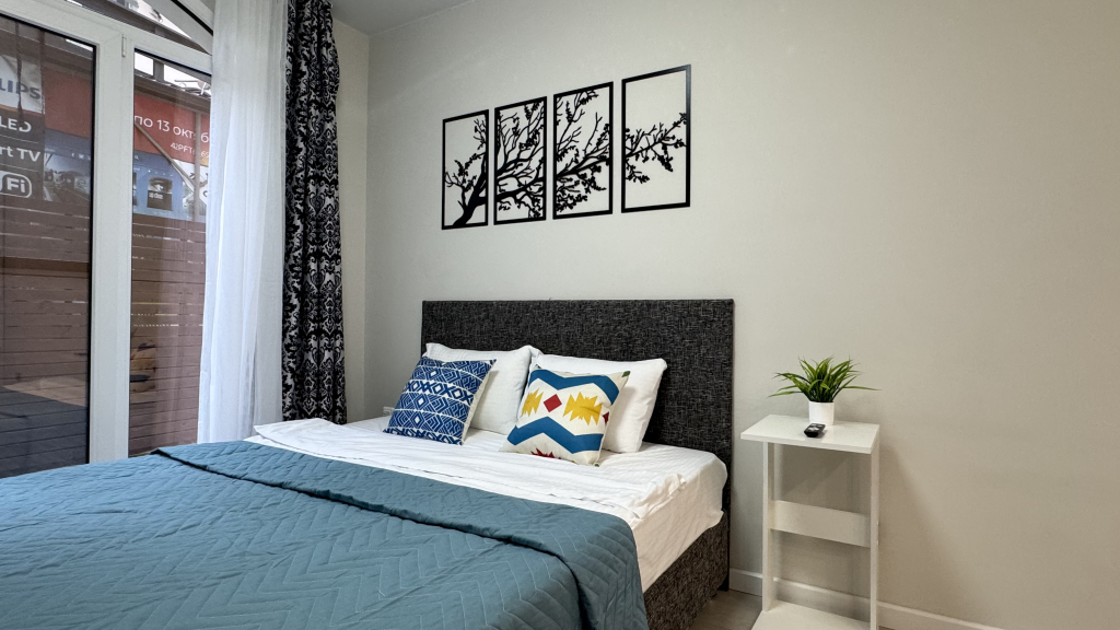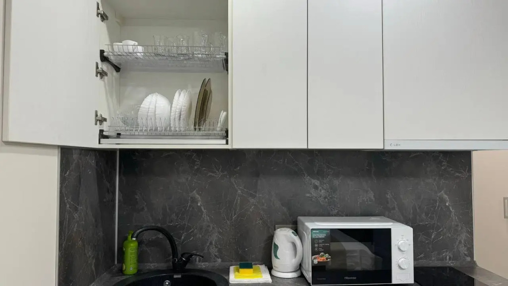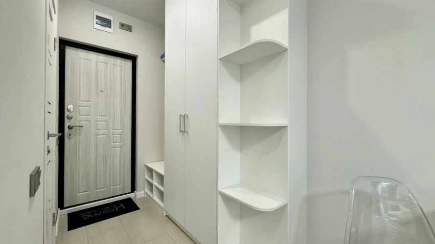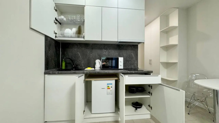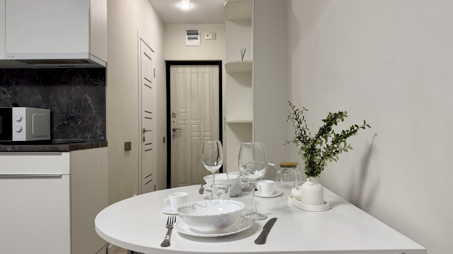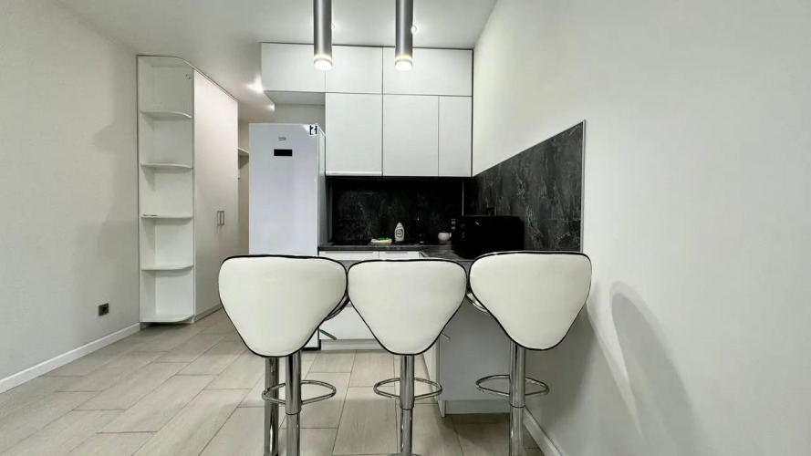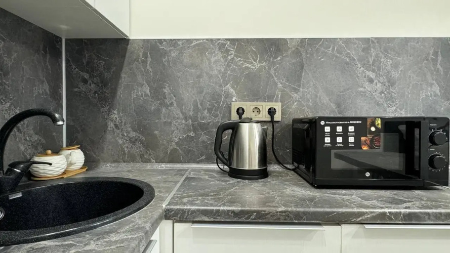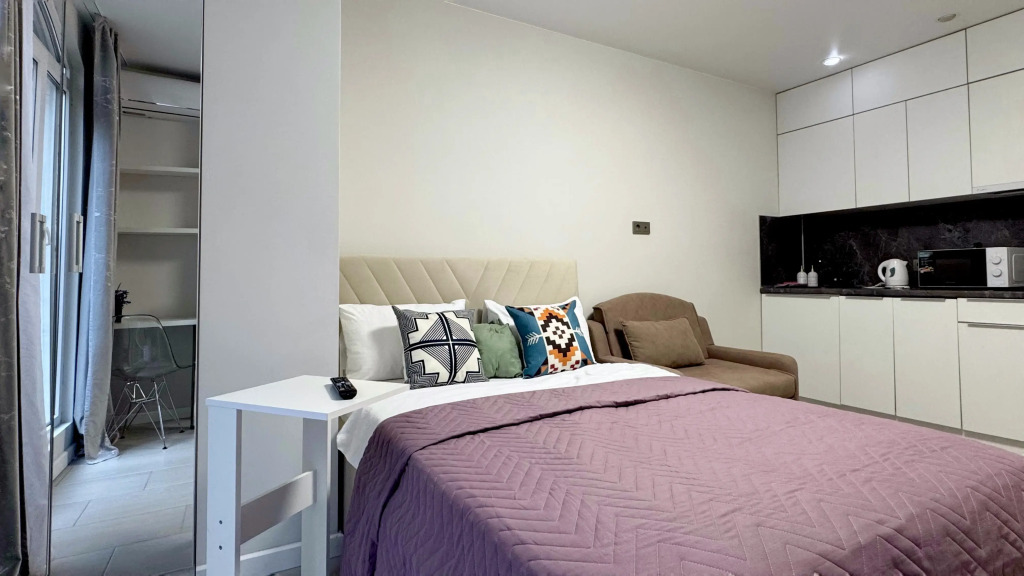 В квартире есть необходимое для проживания гостей: двуспальная кровать, постельное бельё, полотенца, микроволновая печь, электрочайник, кондиционер, телевизор, стиральная машина, двухкамерный холодильник, барная стойка, Smart TV, Wi-Fi, водонагреватель, душ, гель, шампунь, кондиционер, пылесос, тёплый пол.