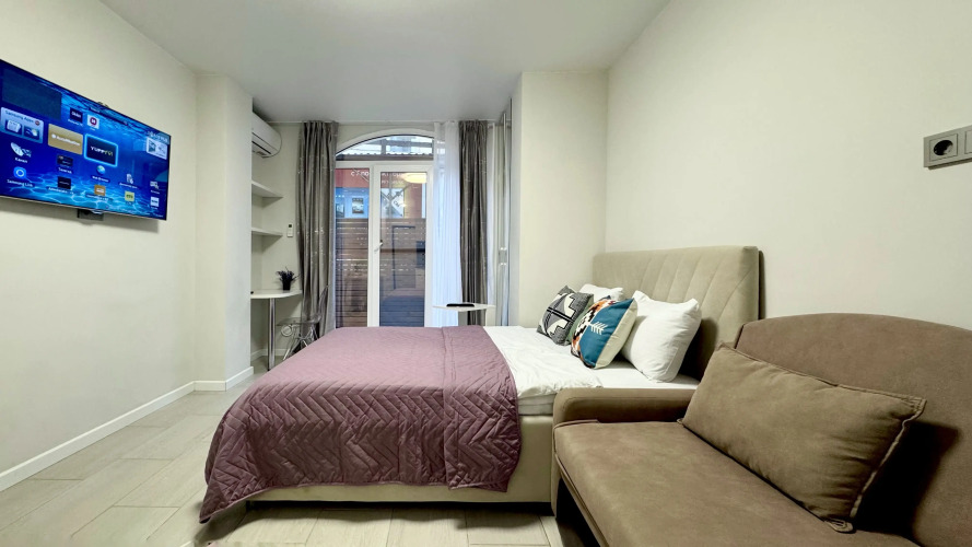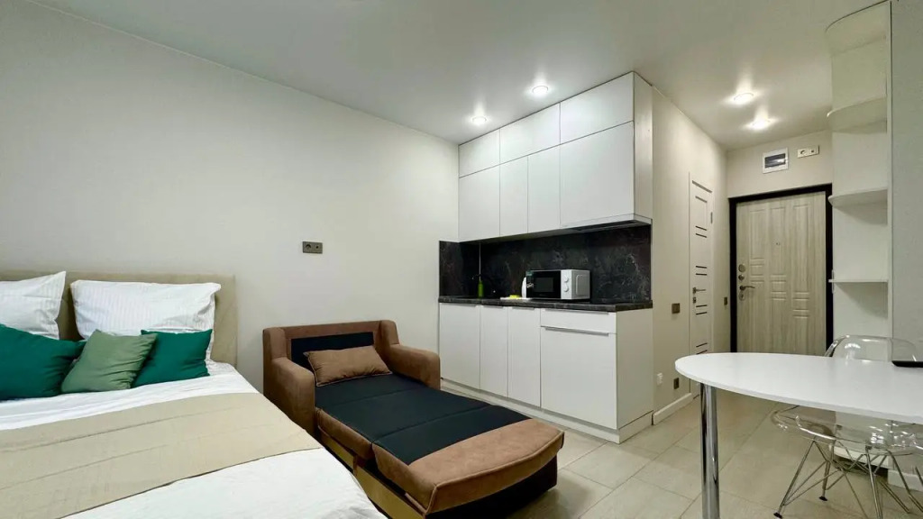 Квартира студия рядом Курортным городком пер. Фермерский 24 располагается в Сочи. В пешей доступности находится море. Квартира расположена рядом с курортный городком, где есть кафе, рестораны, столовые, бар, магазины, пляж. Дорога до моря проходит по ровной поверхности. У дома есть небольшая парковка.