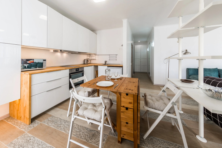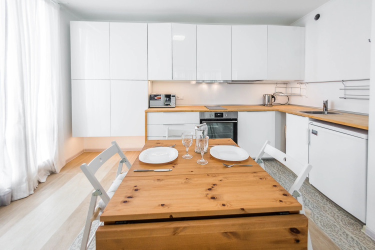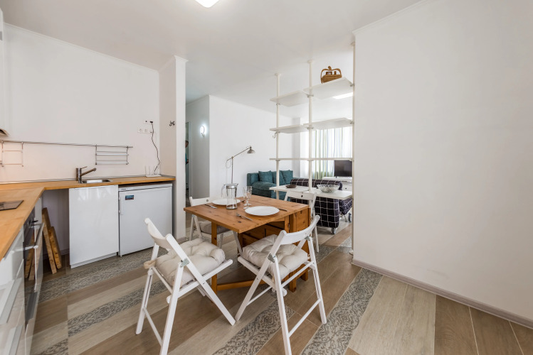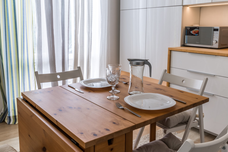 Апартаменты подходят для проживания как одного гостя, так и для семьи до 5 человек. На 40 кв. м располагается кухня-гостиная, укомплектованная кухонным гарнитуром, электроплитой, двухкамерным холодильником, микроволновой печью, чайником, посудой, столом, стульями, диваном для двоих человек, шкафом, телевизором. Также имеется двуспальная кровать, шкаф, кондиционер, совмещенный санузел с душевой зоной, стиральная машина, утюг, гладильная доска, фен, постельное бельё, полотенца, интернет, Smart-телевидение.