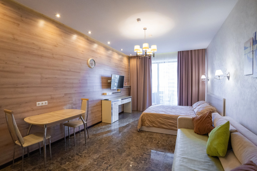 Подходящий вариант для большой компании: апартаменты «Апартаменты студия с видом на город» находятся в Сочи. Эти апартаменты расположены в 6 км от центра города. Рядом с апартаментами — Пляж Заря, Пляж Бытха и Пляж Мацеста.