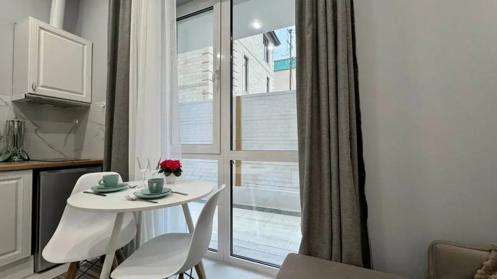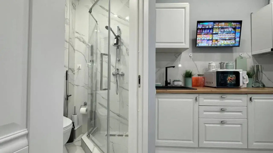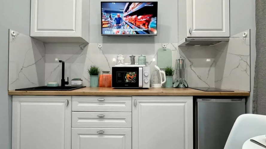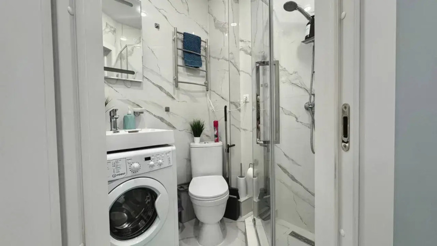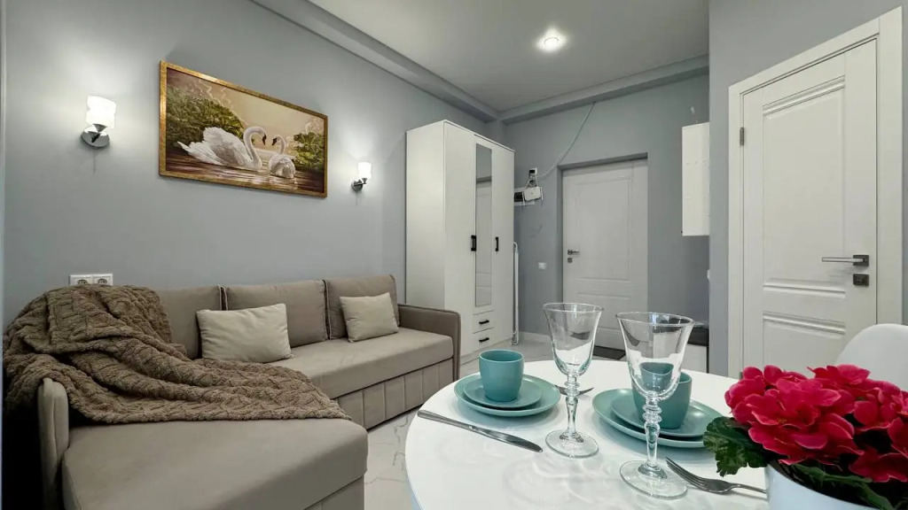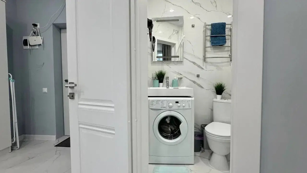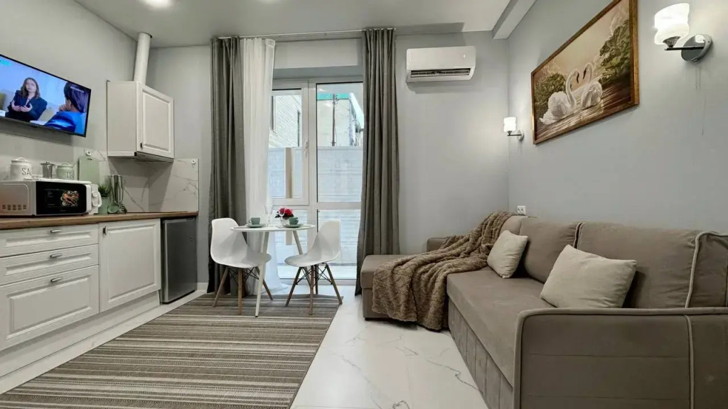 В распоряжении гостей: двуспальный диван, Smart-TV, Wi-Fi, постельное бельё и полотенца для всех гостей, кондиционер (сплит-система), микроволновая печь, электрочайник, стиральная машина, холодильник, фен, утюг, гладильная доска, сушилка, посуда для приготовления и принятия пищи.