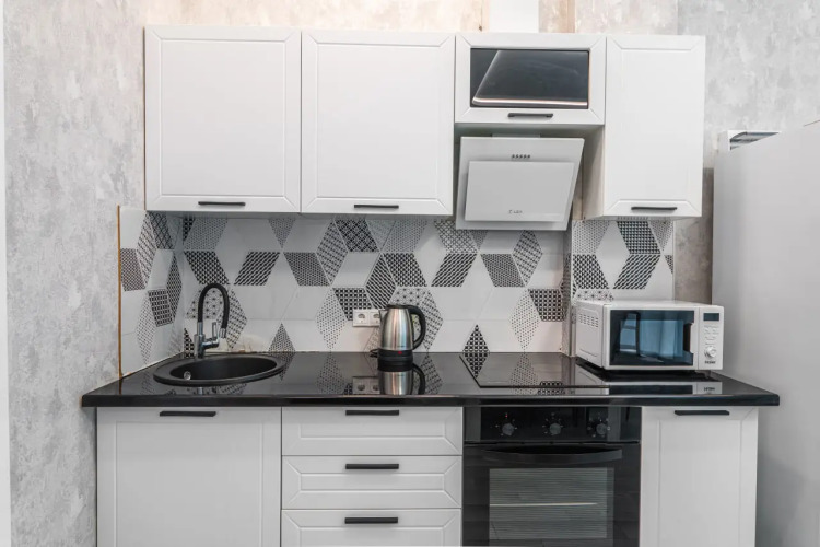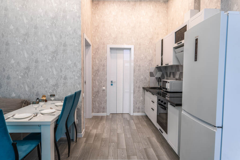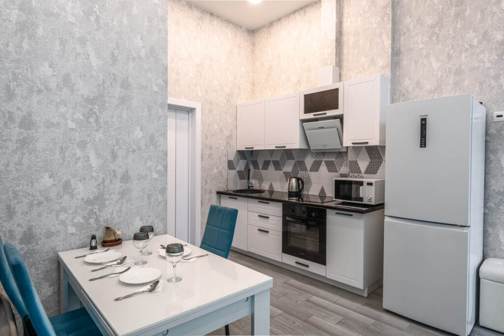 Кухня оборудована для приготовления пищи, есть холодильник и посуда.