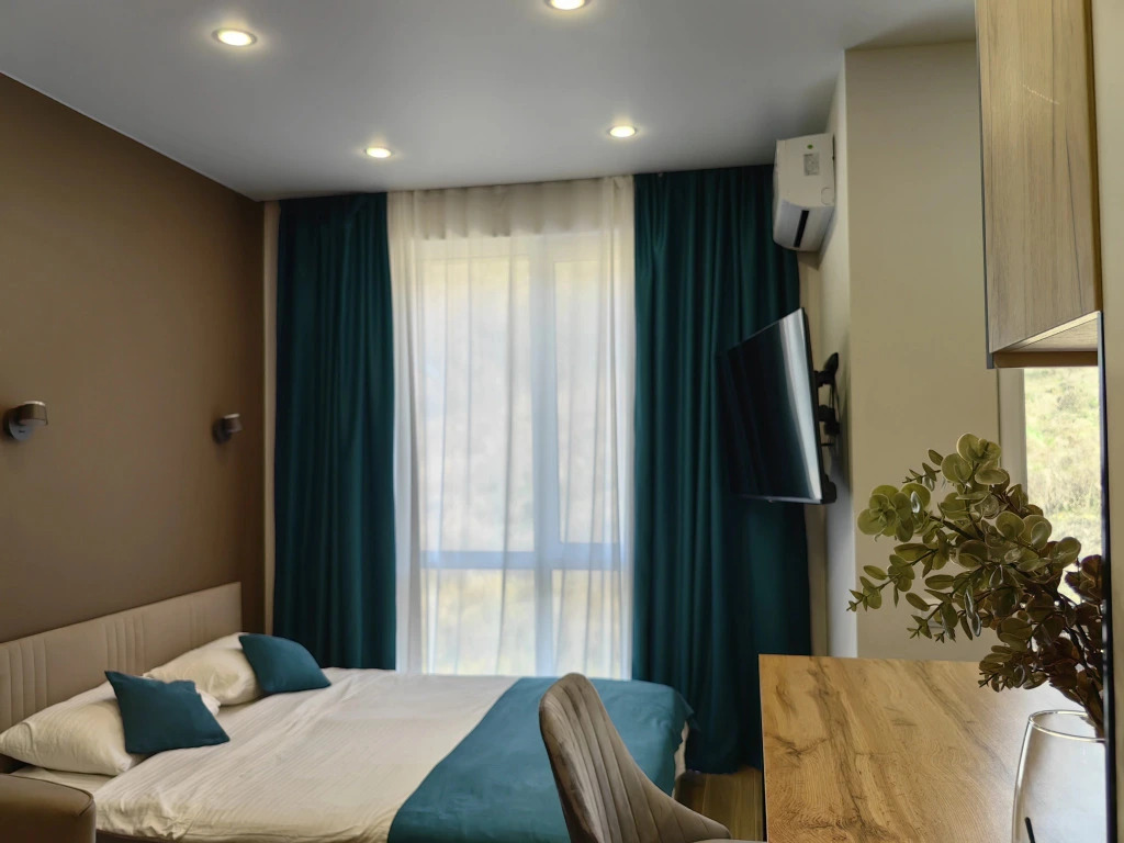 В номере вы найдёте телевизор. Оснащение зависит от выбранной категории номера.