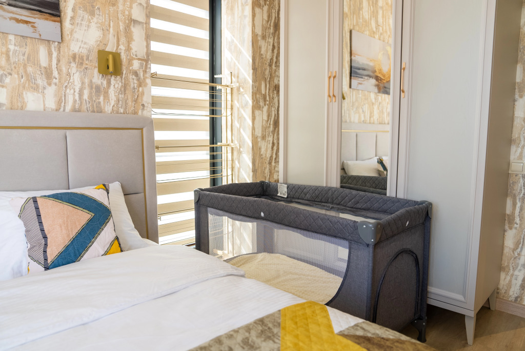Спальная зона апартаментов оснащена кроватью, матрасом премиум-класса и диваном-кроватью для дополнительного гостя, а также шторами блэкаут.