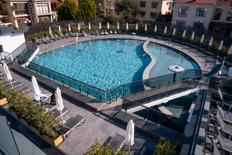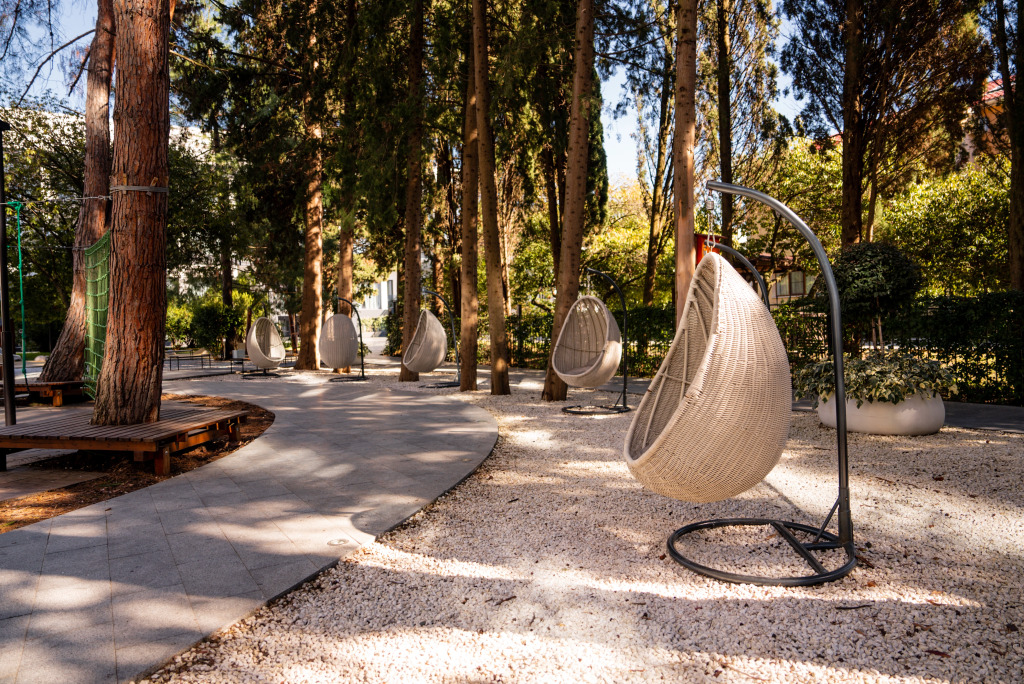 На территории отеля для бесплатного пользования имеются круглогодичный подогреваемый бассейн с детской секцией, детская площадка с верёвочным парком, спортивный зал для активного отдыха, а также ресторан с авторской кухней и барбекю-зона для семейных вечеринок.