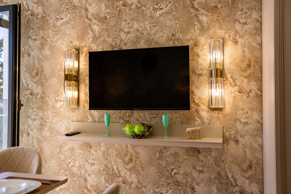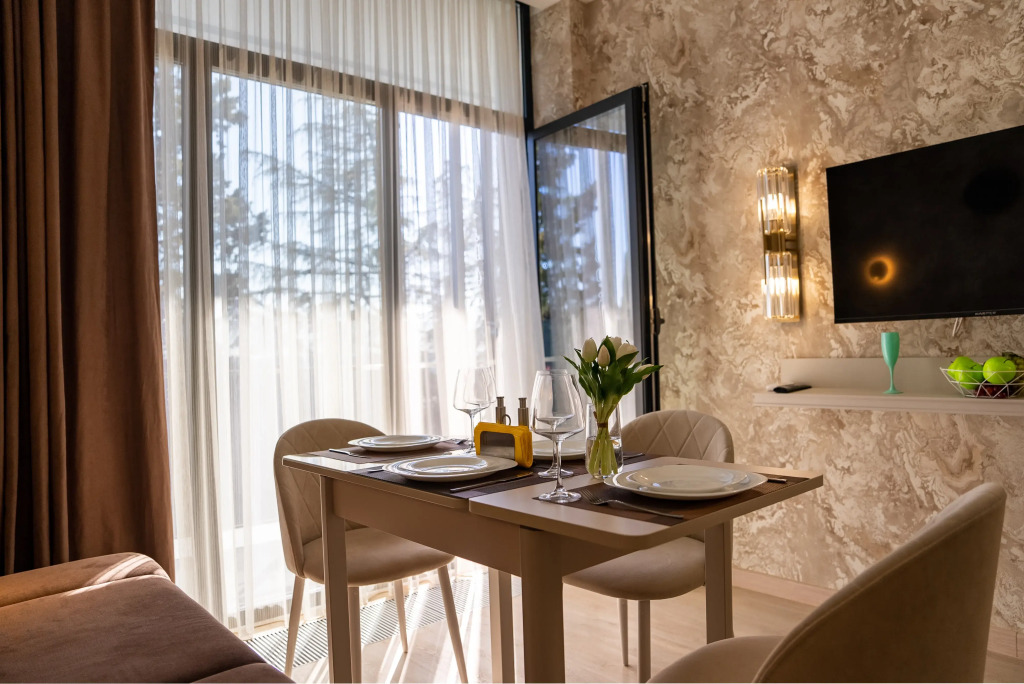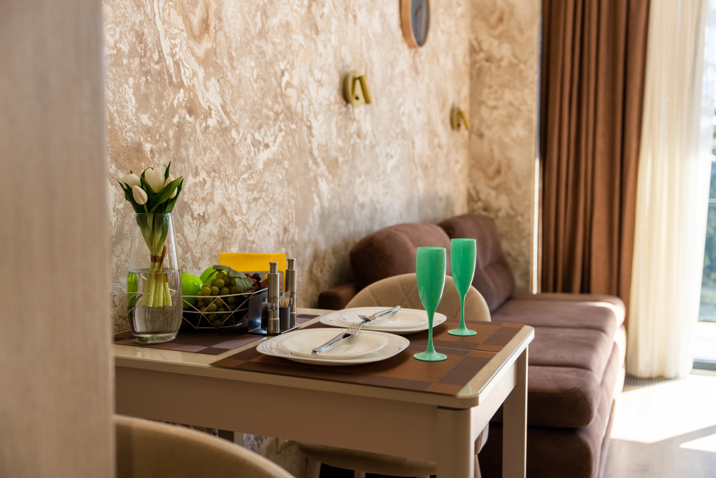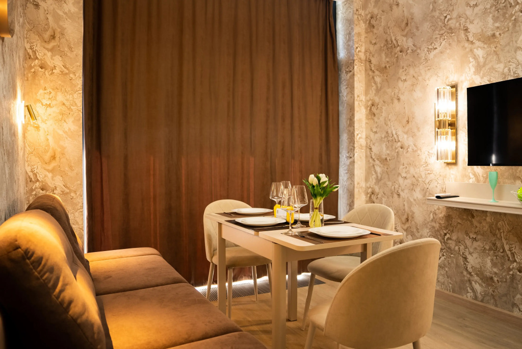 В апартаментах есть оборудованная кухня с обеденной зоной, бытовая техника: кондиционер, микроволновая печь, холодильник, плита, чайник, утюг и гладильная доска. Ванная комната оборудована душевой кабиной и гигиеническим душем. Работает интернет. Предоставляются тапочки и халаты для каждого гостя, комплект полотенец, а также средства гигиены.