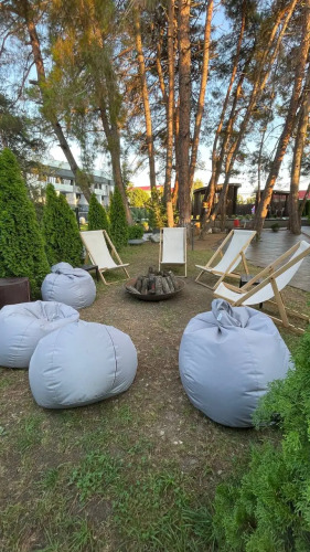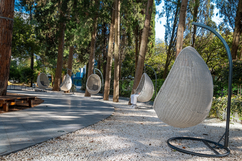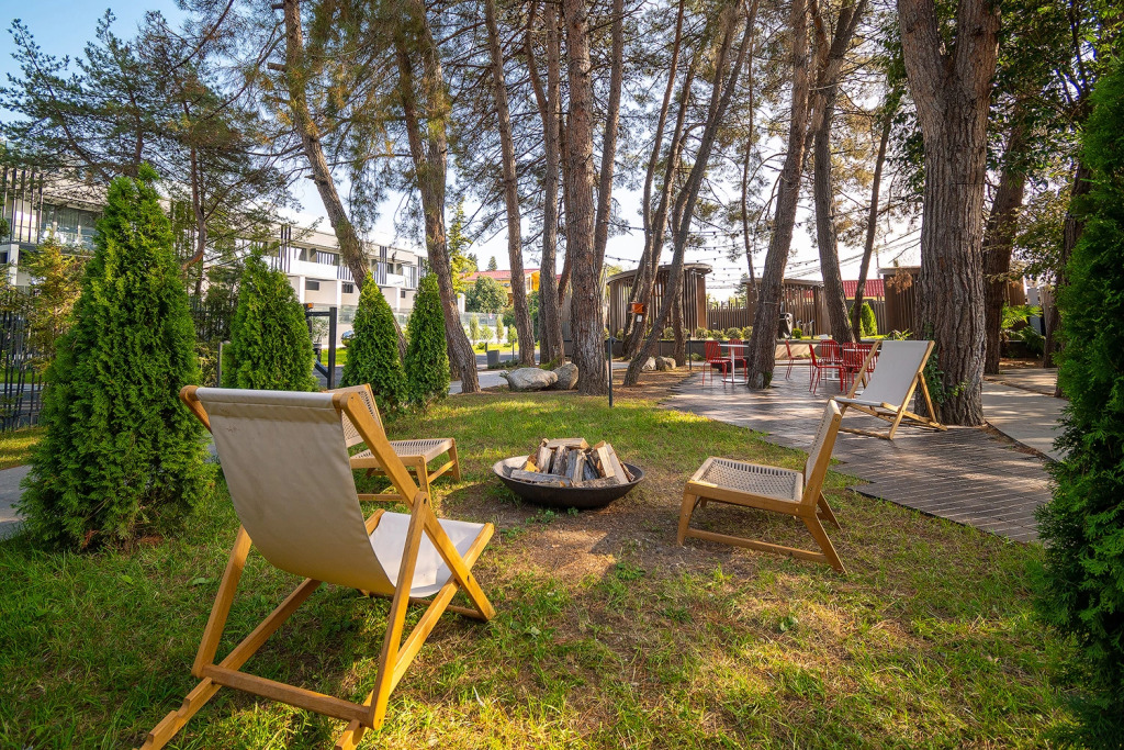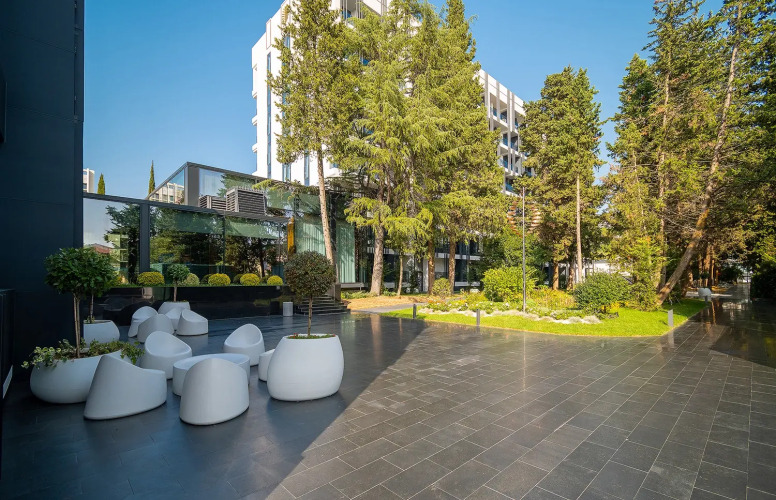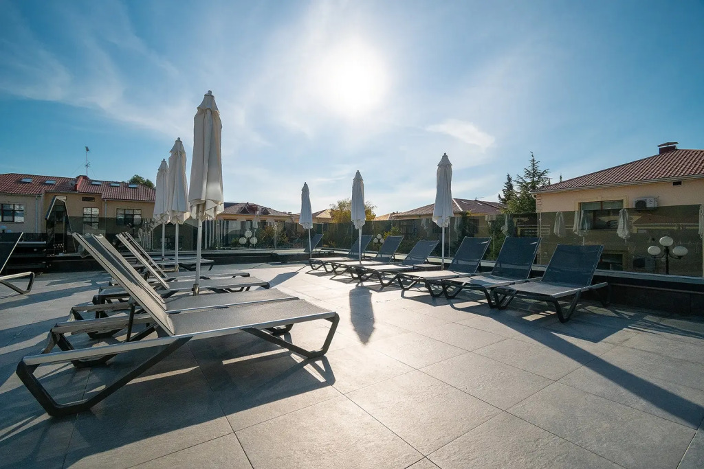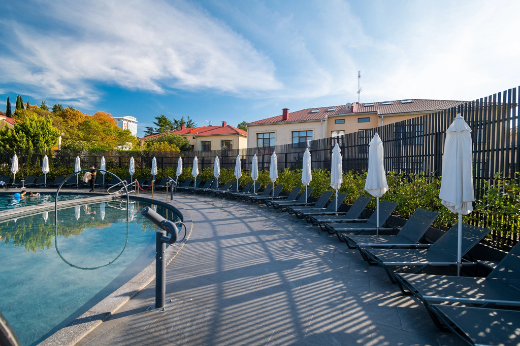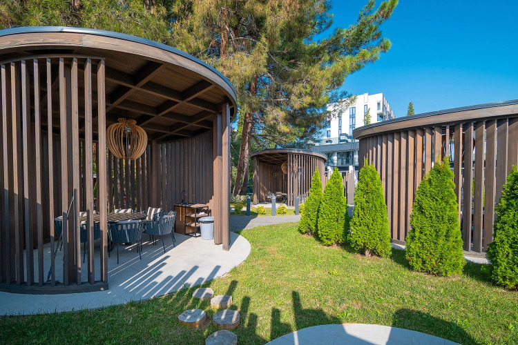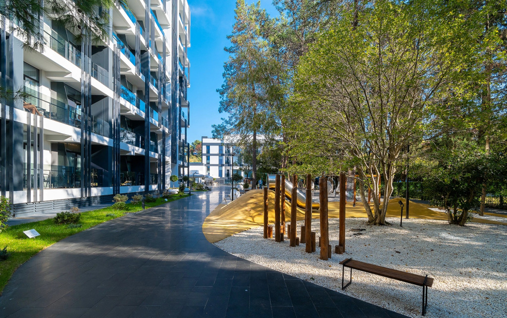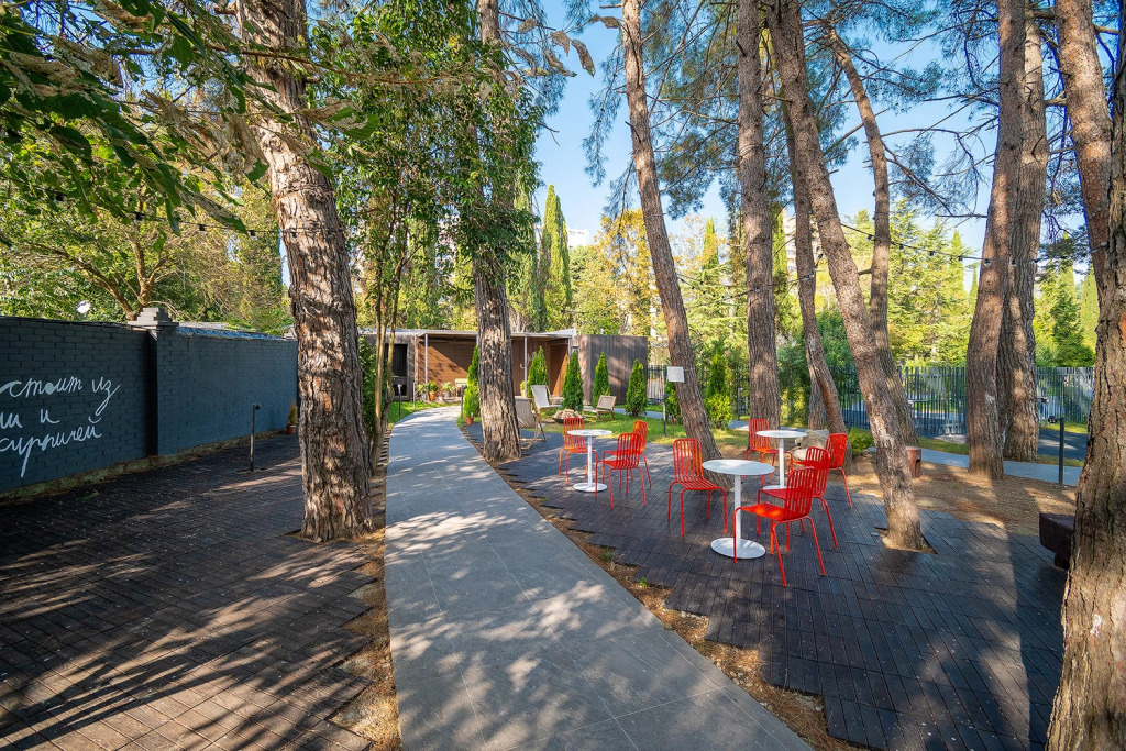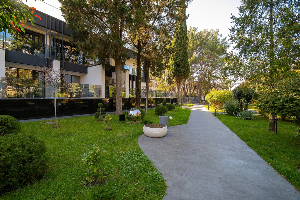 На территории расположился парк с деревьями. Территория предусматривает зоны отдыха, детскую площадку, открытый круглогодичный подогреваемый бассейн и зону-барбекю.