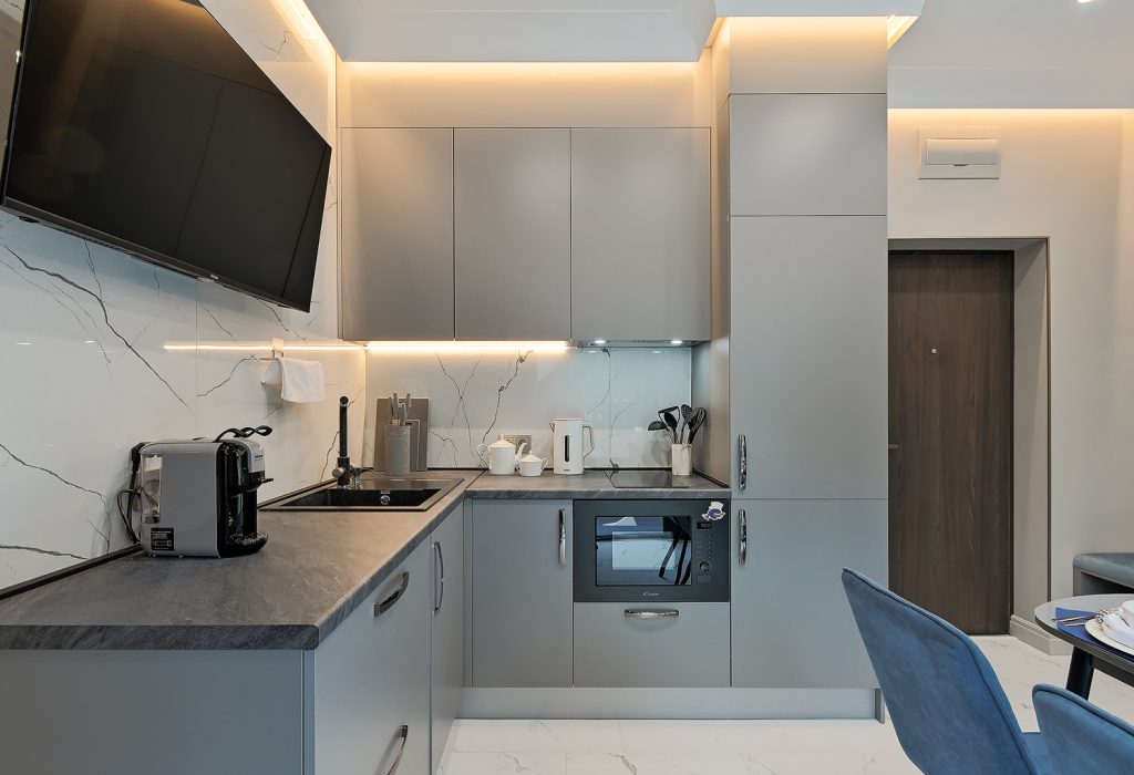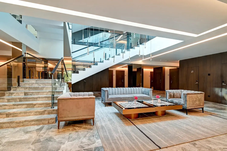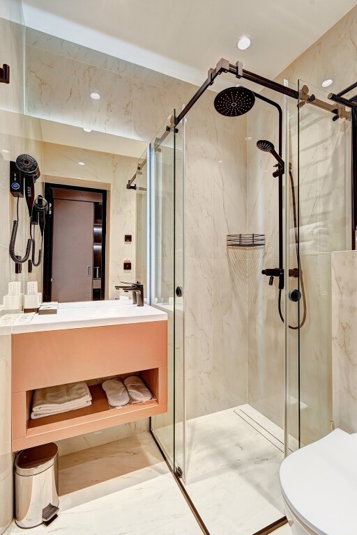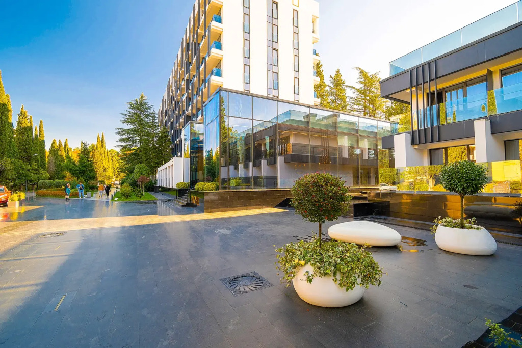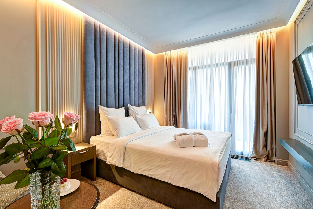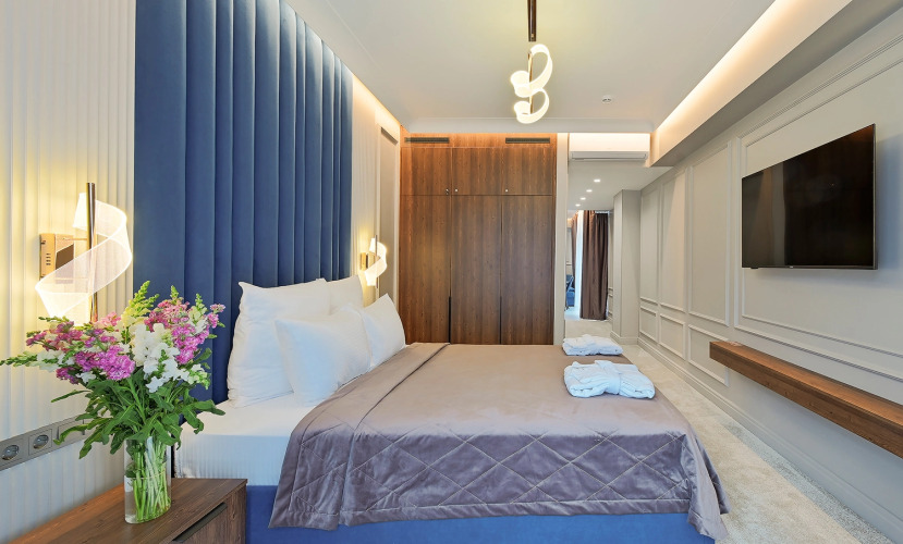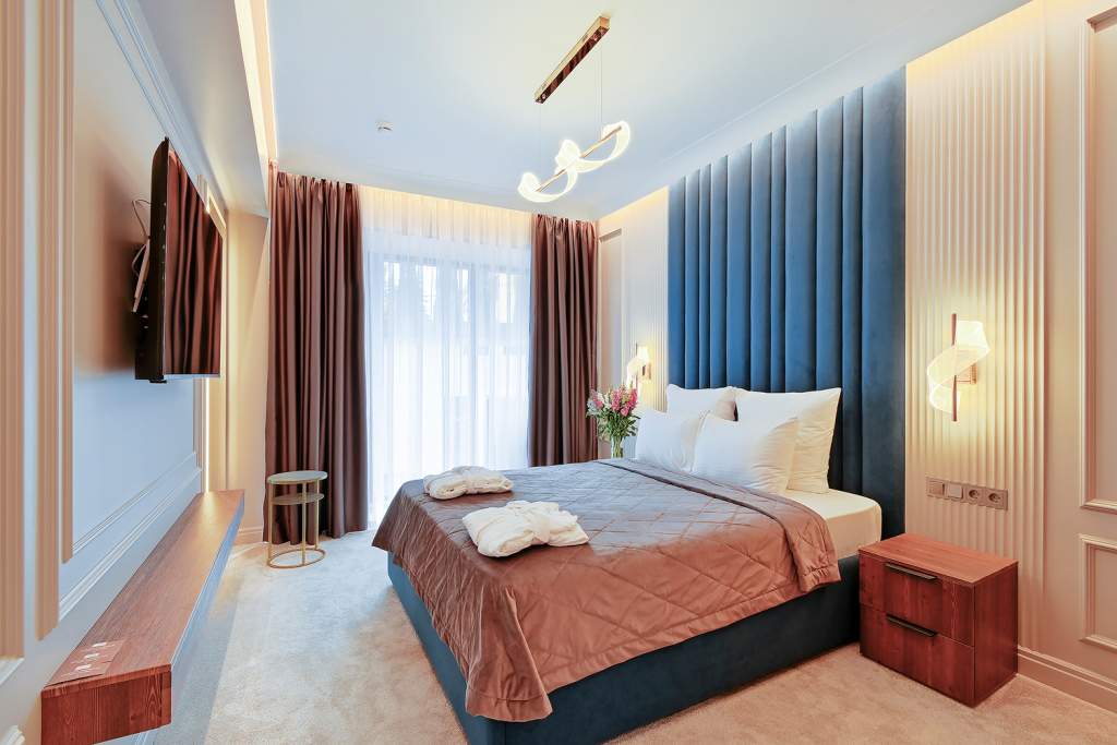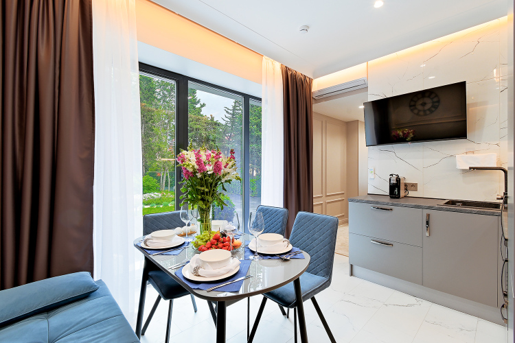 Апартаменты с балконами и панорамными окнами и видом на море или на сад. В апартаментах есть двуспальная кровать, ванная комната с душевой кабиной и набором косметики, халаты, тапочки и полотенца для каждого гостя, звуконепроницаемые окна, Wi-Fi, телевизор с плоским экраном, кондиционер, чайная станция с набором для приготовления чая и кофе.