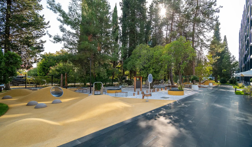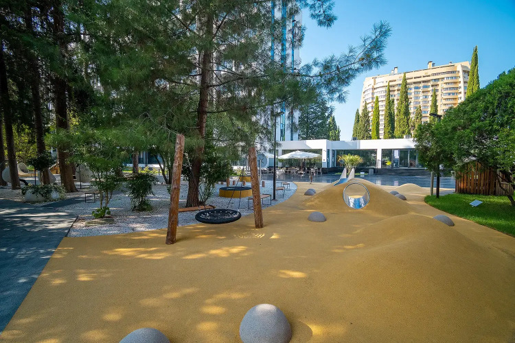 На территории есть удобства для маленьких гостей, такие как: детская комната с зоной отдыха (на платной основе), детская площадка с качелями, слуховыми трубами, холмами с мягким покрытием, верёвочным парком и креслами-коконами, в которых могут также отдохнуть и родители, детская секция бассейна с водными пушками, фонтанами и горкой.
