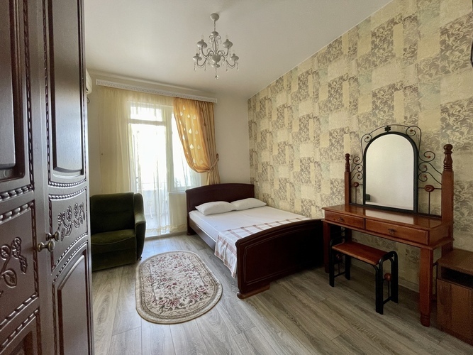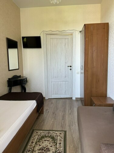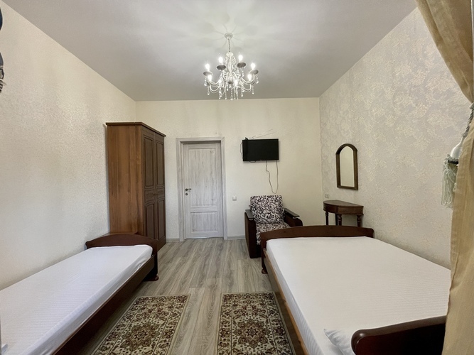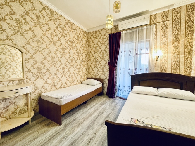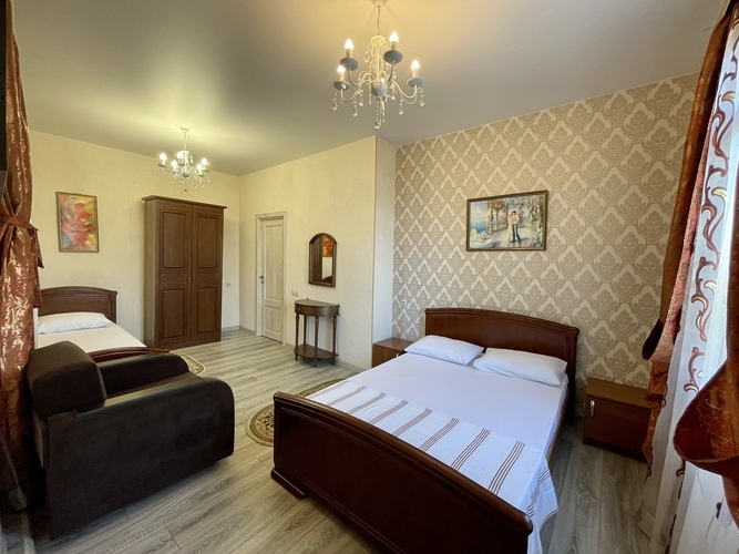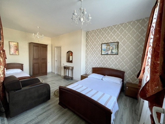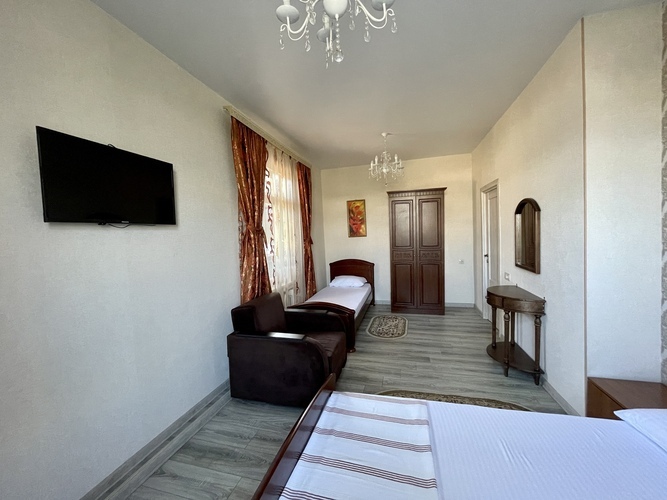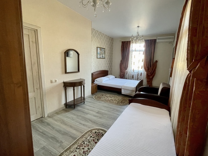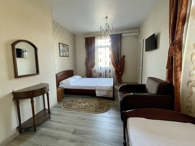 Комфортабельный и красивый номер для проживания троих человек. Санузел и душ в номере. Мебель: односпальная и двуспальная кровати, кресло, шкаф, стулья, кресла, прикроватные тумбочки. туалетный столик, стол, вешалка, зеркало, кухонный гарнитур Удобства: кондиционер, телевизор, цифровое ТВ, интернет, холодильник. В одном из номеров есть балкон, во втором кресло-кровать (доп место).