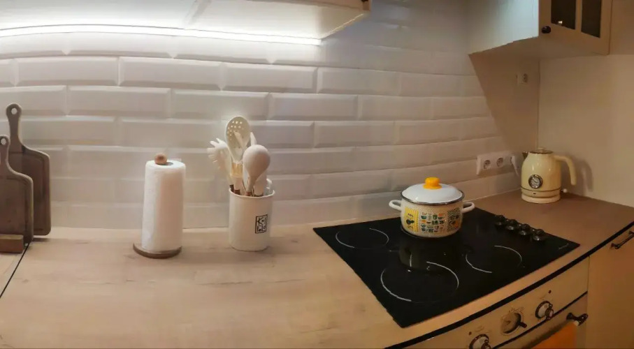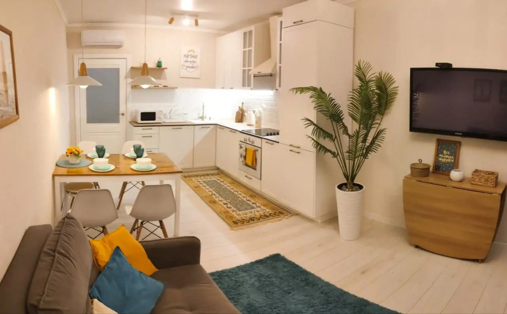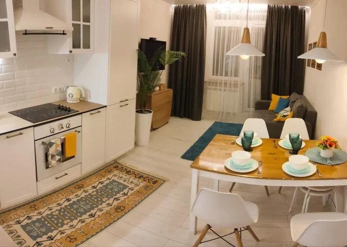Кухня-гостиная оснащена бытовой техникой и посудой. Имеется двухкамерный холодильник, посудомоечная машина, микроволновая печь, варочная панель, столовые приборы, тарелки, кружки, стаканы, бокалы, кастрюли и сковорода, обеденный стол. В гостиной зоне расположен раскладной диван-кровать шириной 140 см и телевизор.