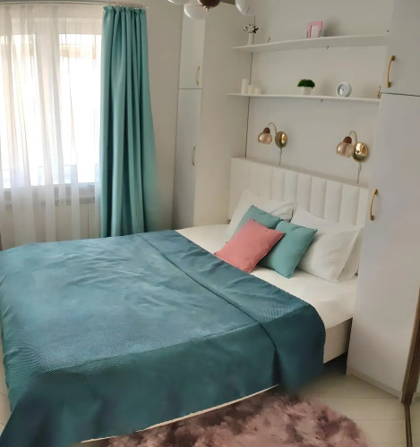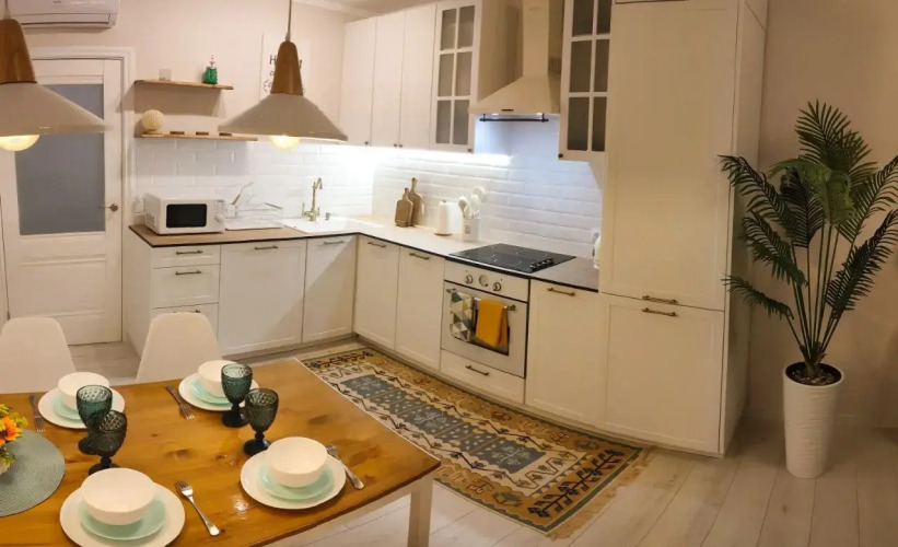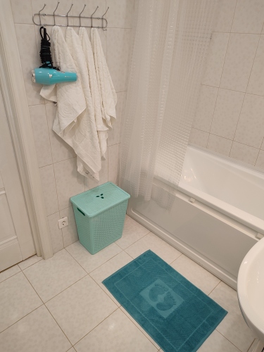 Квартира с двумя отдельными спальнями и кухней-гостиной подходит для проживания до 7 гостей. В каждой комнате есть кондиционер. Предоставляется подключение к сети Wi-Fi, постельное бельё, банные и лицевые полотенца, шампунь, гель для душа, жидкое мыло, средство для мытья посуды, стиральный порошок, туалетная бумага, чай, растительное масло. Также имеется утюг, гладильная доска, пылесос, фен.