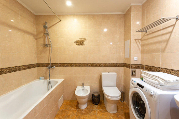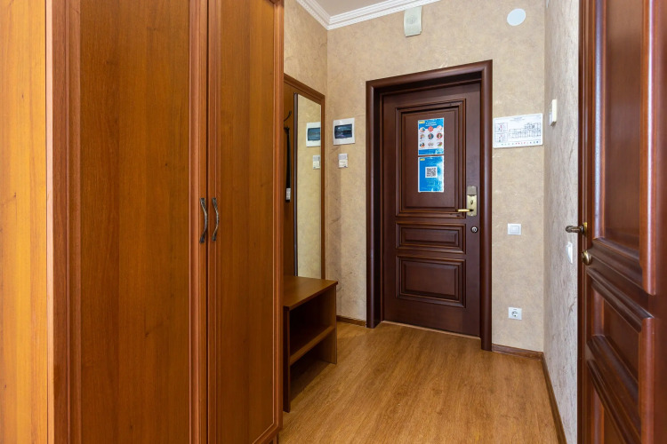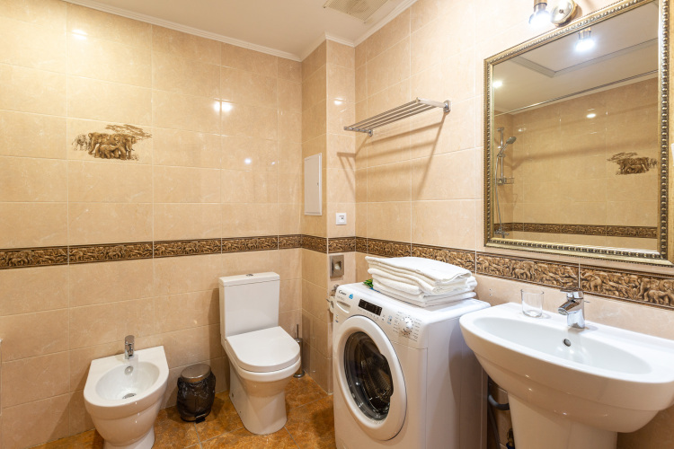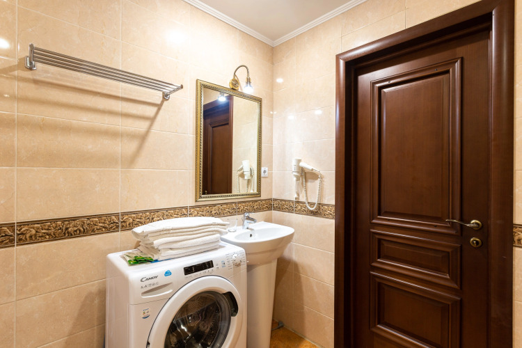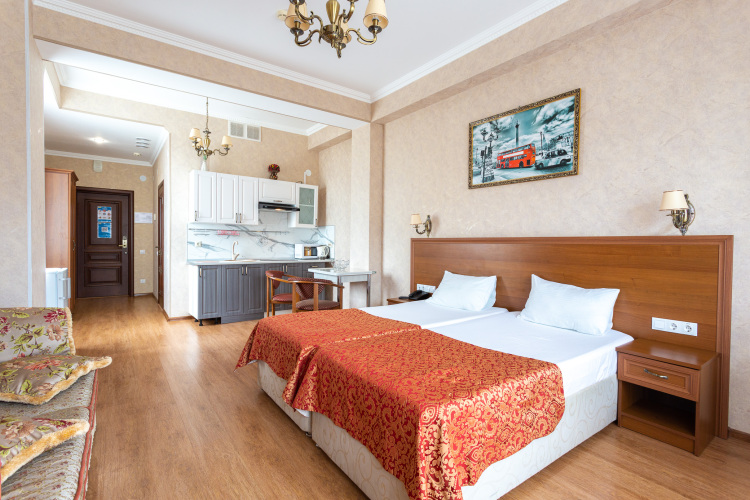 В апартаментах: две односпальные кровати с ортопедическим матрасом, диван-кровать для детей до 9 лет, балкон с ротанговой мебелью, обеденный стол со стульями, рабочая зона с зеркалом, телевизор, шкаф, отельная система кондиционирования, стиральная машина, утюг, гладильная доска, фен, ванная, унитаз и биде, полотенцесушитель, уборочный инвентарь, сейф, кухня со всей необходимой посудой, микроволновая печь, чайник. плита, холодильник, кабельное телевидение, высокоскоростной интернет.
