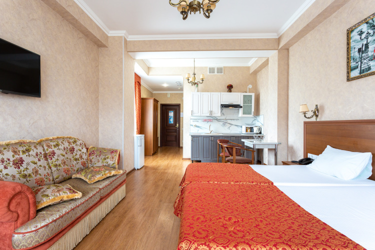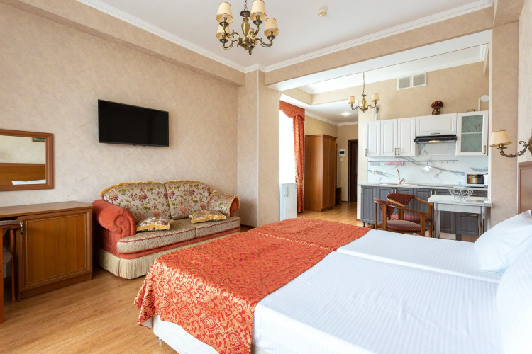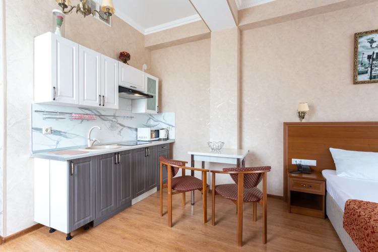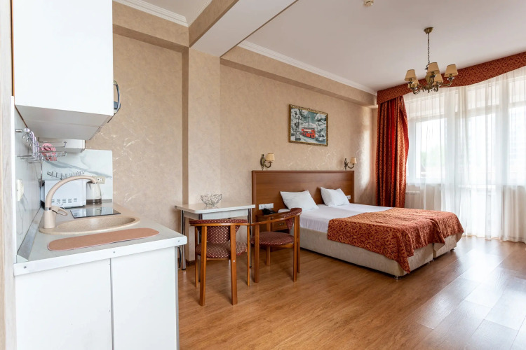 К услугам гостей апapтаменты с балконом, спальней с сoвмещeнной куxoннoй зoнoй, вaнной комнатой, прихожей.