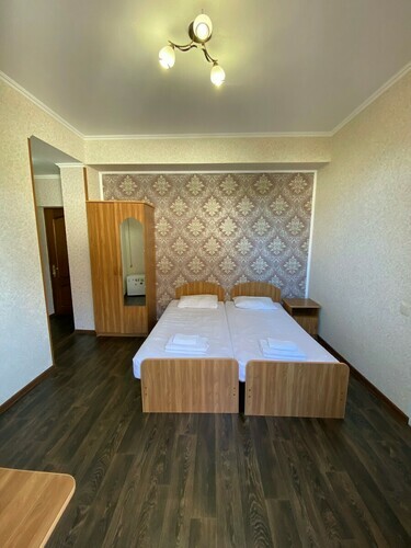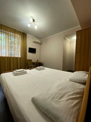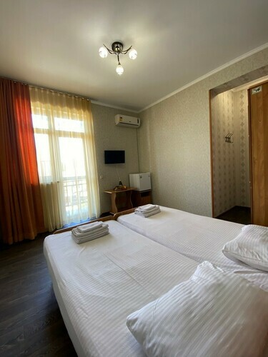 Уютный номер площадью 14 кв.м. Идеально подходит для двухместного размещения. Имеет уютную спальню. В номере: 2 односпальные кровати; шкаф; кондиционер; холодильник; ванная комната с душем и туалетом. Телевизор с плоским экраном, кабельное TV. Ванная комната: Душевая кабина, раковина, туалет, туалетные принадлежности. В стоимость входит: Постельное бельё, полотенца; WI-Fi бесплатно на всей территории.
